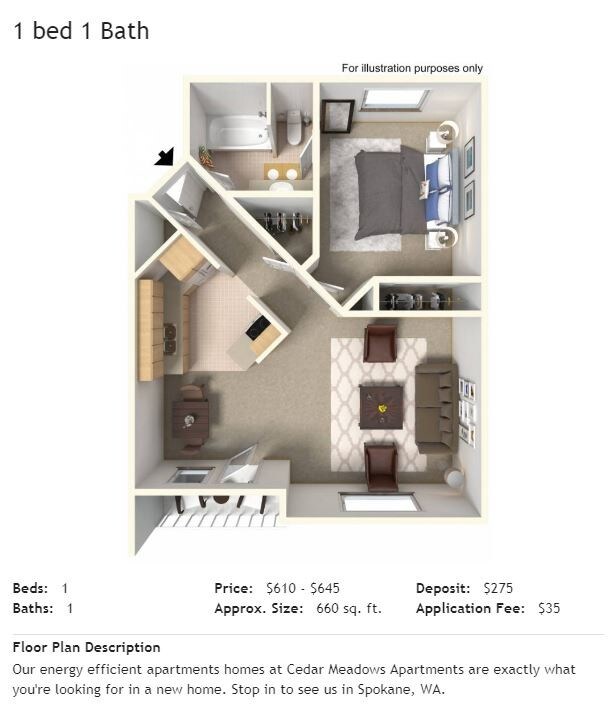 Cedar Meadows offers 1 to 2 Bedroom apartments starting from $1,010 and having 660–856 sq ft. Here is the current pricing and availability: