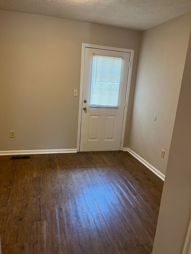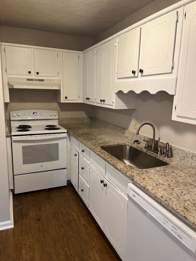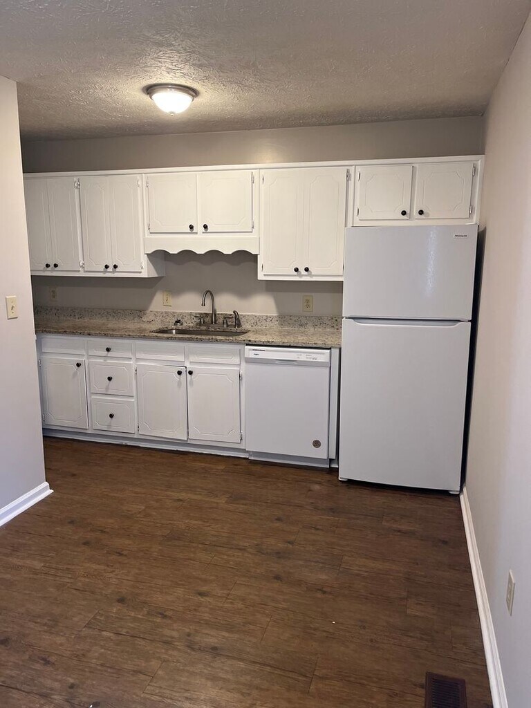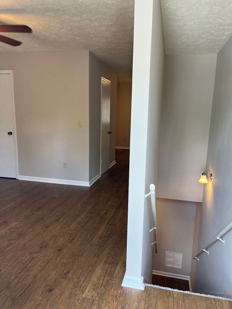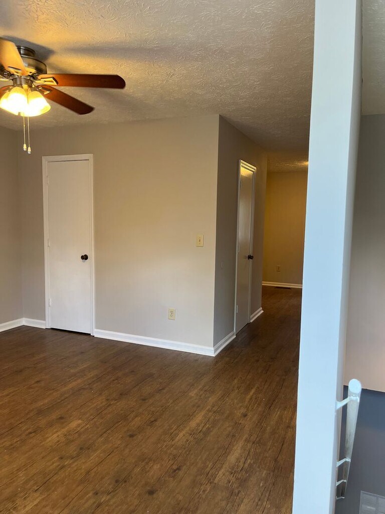 Conveniently located townhouse with 2 bedrooms, 1.5 bathrooms, central heat and air, main level has vinyl plank throughout with bedrooms and stairs carpeted. Window blinds are included. All appliance kitchen with Granite Countertops. Refrigerator, stove, oven, dishwasher, laundry hookups and a private back patio. There is a sparkling swimming pool and conveniently located trash compactor on Atlanta Highway. Tenants do have to haul off their own trash.
