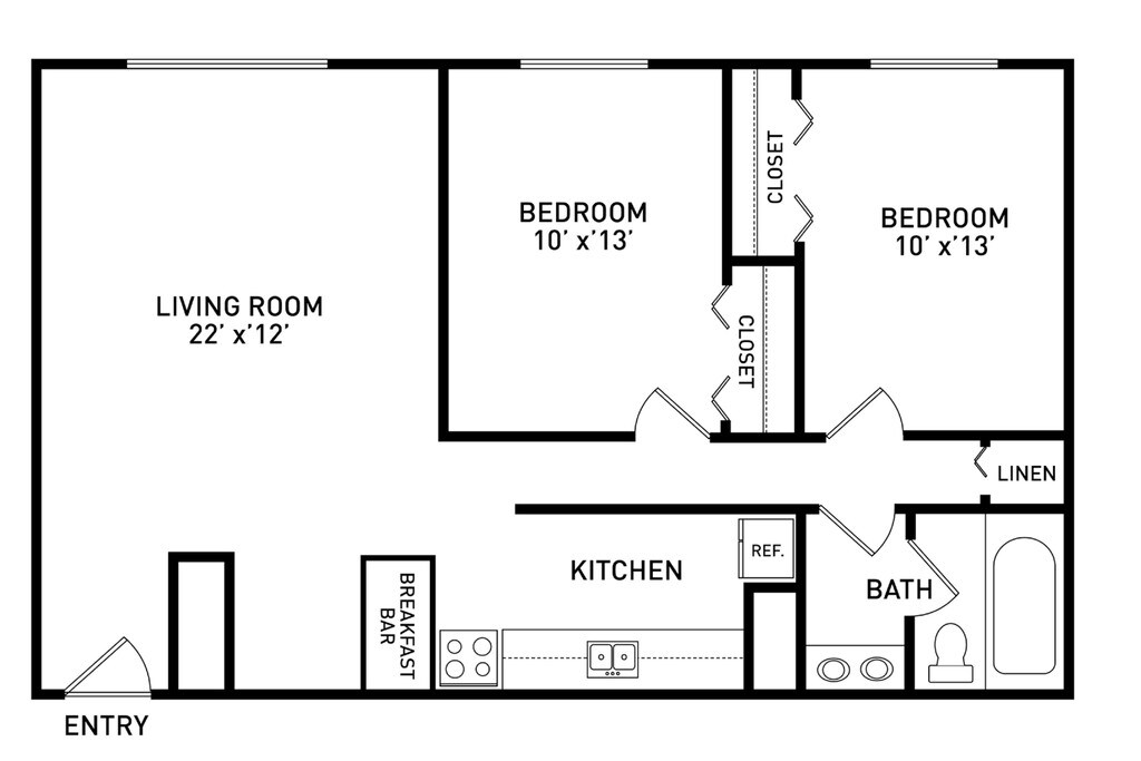 2 Beds, 1 Bath, 726-1000 sq ftLargest 2 BedroomThis is the largest 2 Bedroom at this PropertyModel Gallery
