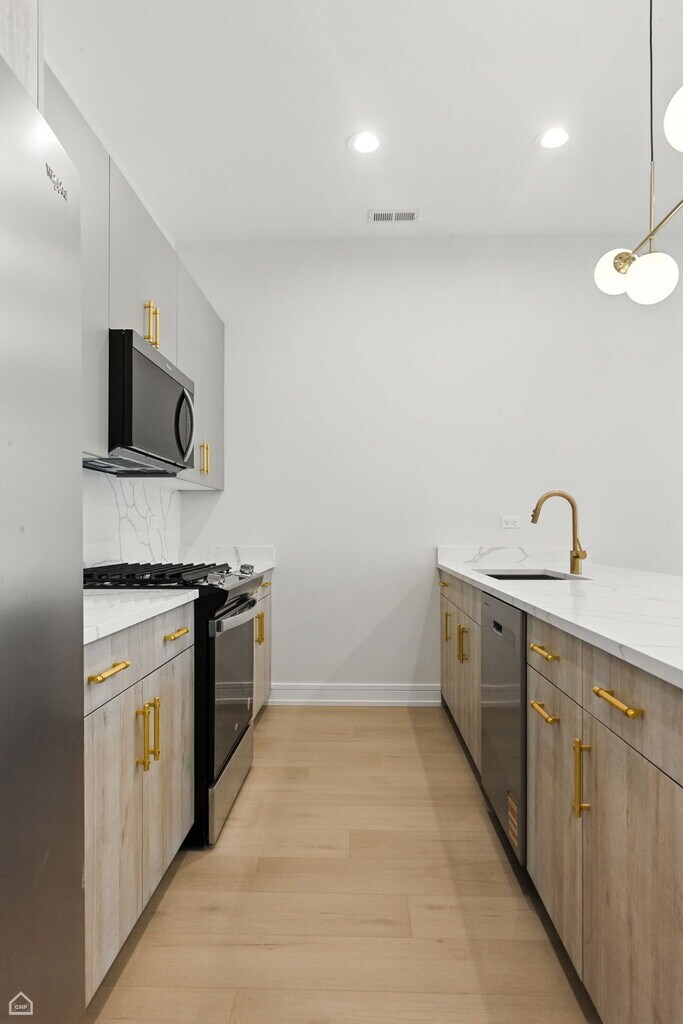 BRAND NEW 3-Bed/2-Bath Bronzeville Condo w/ Luxury Finishes. Deposit and move-in fee waived! Be the very first to live in this stunning, brand-new construction condo, completed in 2025! This unit offers a sophisticated urban lifestyle in the highly desirable Bronzeville neighborhood. Unit Features: - Gourmet Kitchen: High-end finishes featuring quartz countertops, stainless steel appliances, and custom cabinetry. - Parking: One garage space included (EV ready). - Comfort & Convenience: Central heat and A/C, in-unit washer/dryer, large closets, outdoor balcony, and large backyard. - Location & Lifestyle: Enjoy a prime location with easy access to public transit (Green Line), local shopping, major healthcare facilities, and the University of Chicago campus.