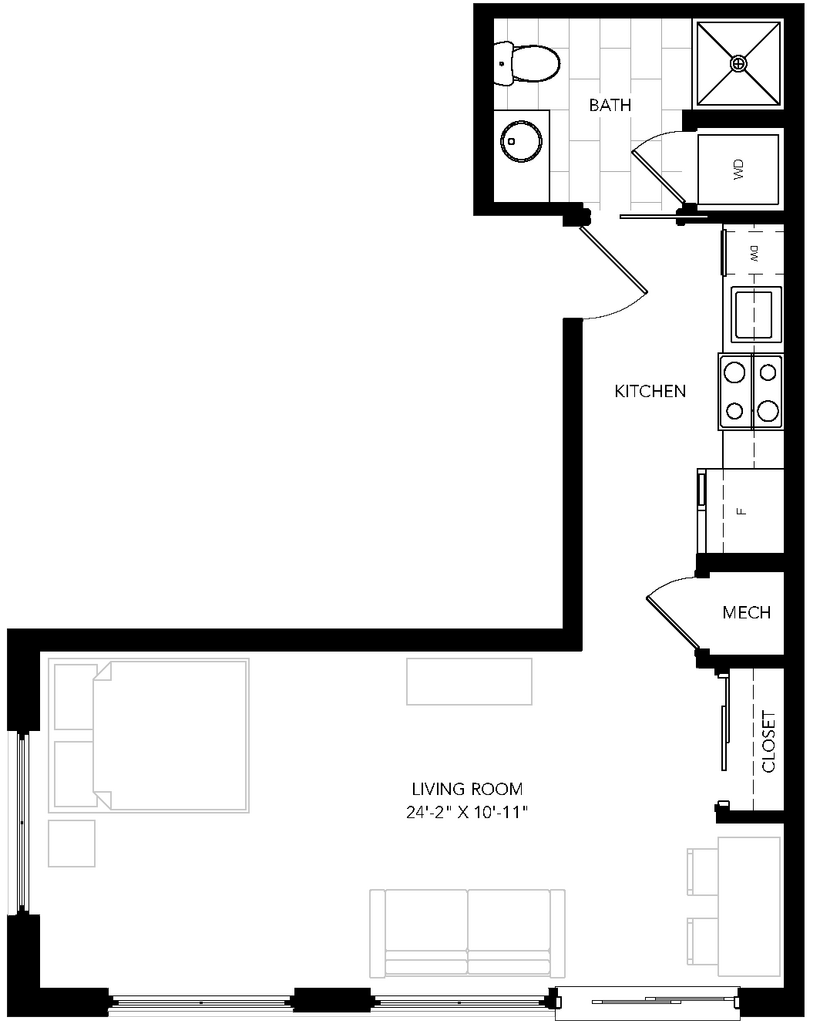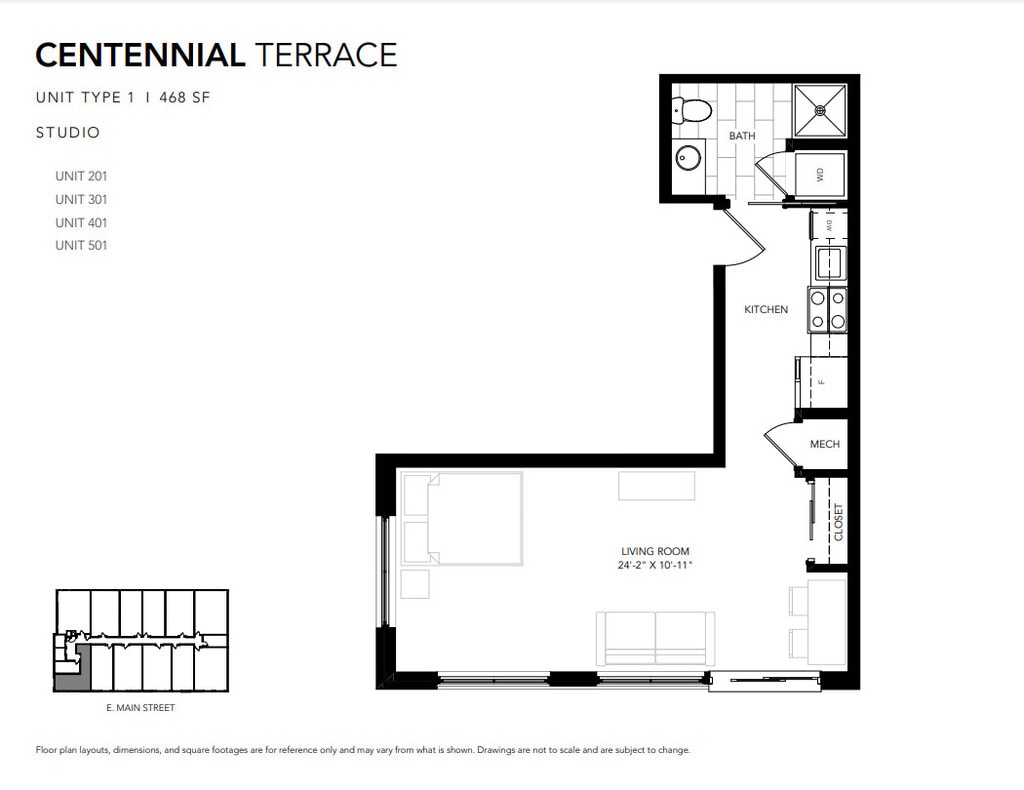 Studio - Unit Type 1 - Floorplan 10 Apartment Unit: 301Apartment Model: Studio - Unit Type 1$1,196Studio, 1 Bath, 468 sq ftAvailable December 26, 20251 Bedroom