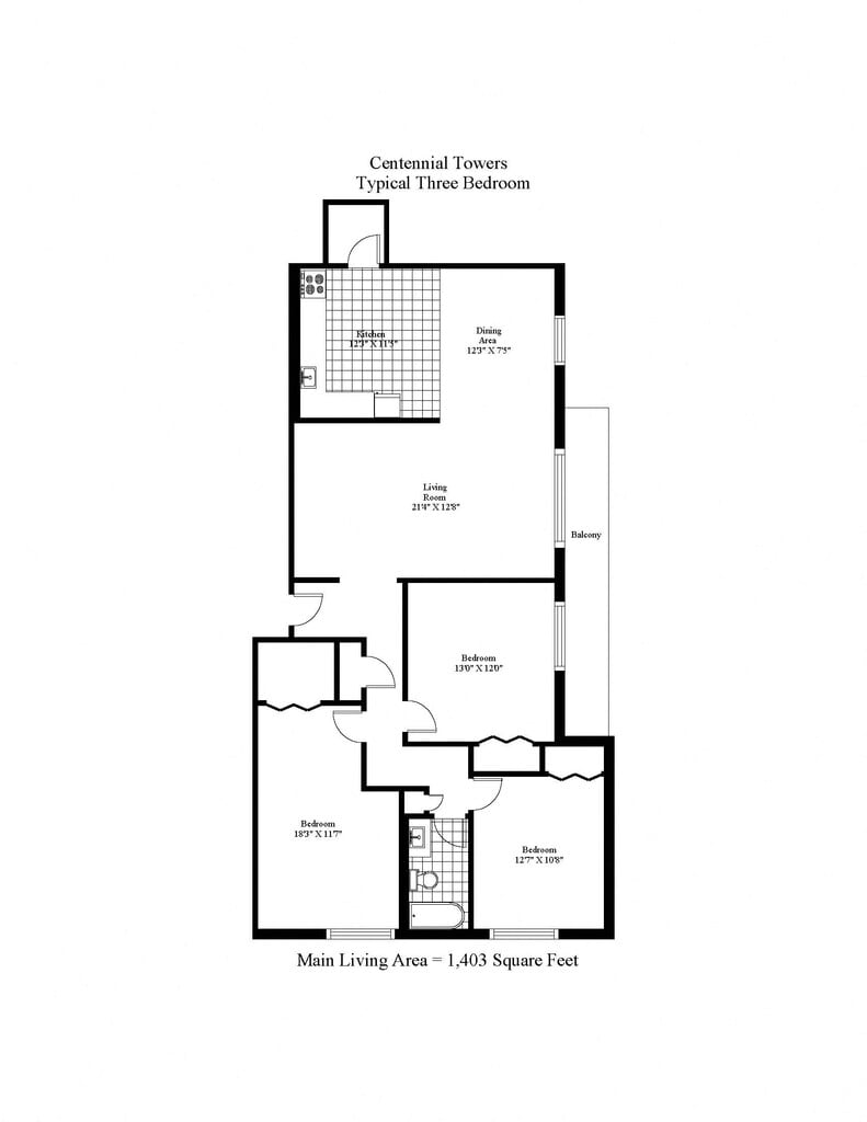 Three Bedroom - Floorplan 1 Apartment Unit: 141-206Apartment Model: Three Bedroom3 Bedroom, 1 Bath, 1403 sq ftAvailable December 15, 2025