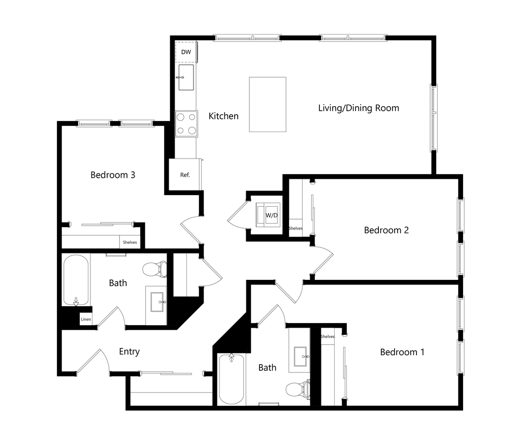 - Studio, one-, two-, and three-bedroom units