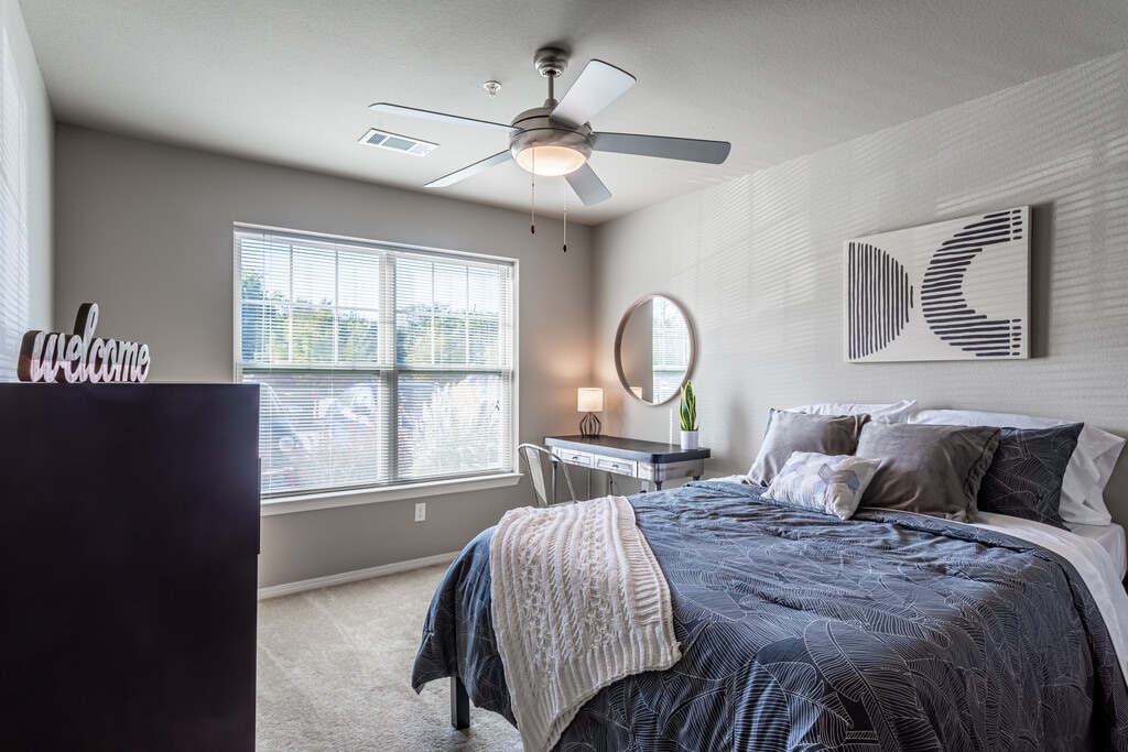 Conveniently located across from Baum Stadium Huge living spaces Resort-style swimming pool 24/7 fitness center Game lounge Cyber Café Computer lounge with free printing Outdoor community grill & kitchen Outdoor fire pit Pet friendly with dog walking area Motorcycle/scooter parking Bicycle racks Reserved parking On-site management Apartment Features Individual leases Electronic deadbolts on front doors Bedroom door locks Move-in ready Fully-furnished open floor plans Fully-equipped kitchens Full-size washer & dryer included Large private bedrooms Private full bathrooms Private walk-in closets High-speed Internet access Wi-Fi everywhere TV Package with ESPN.