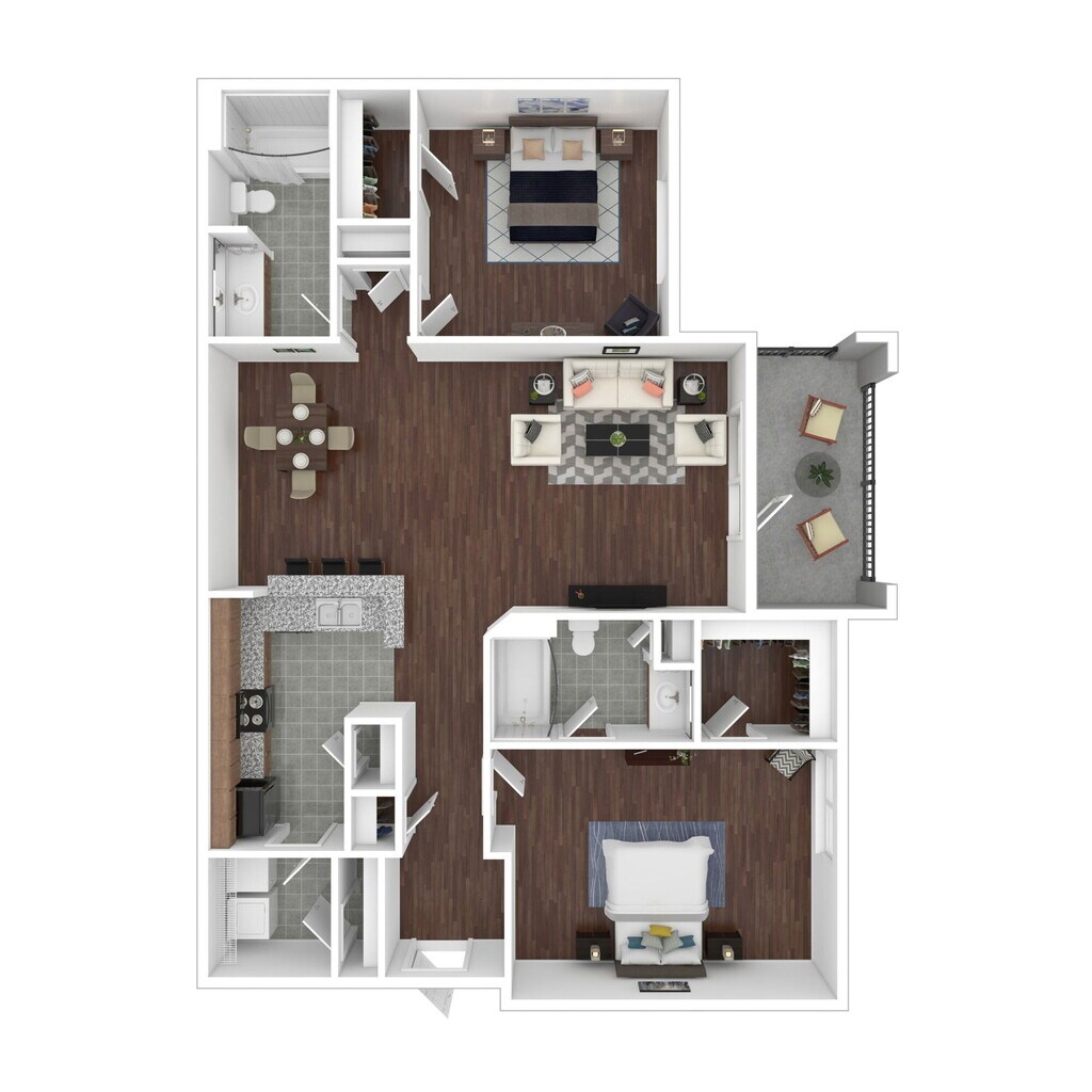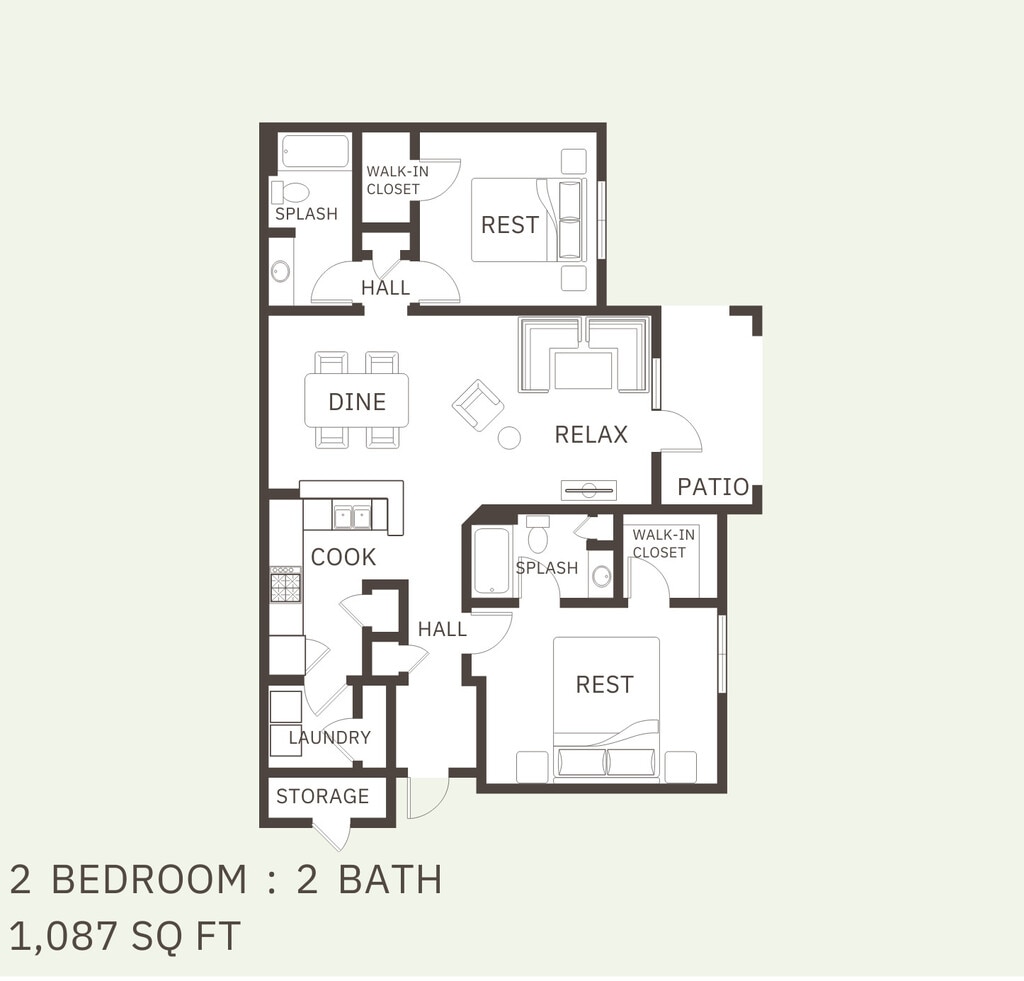 Apartment Model: Two Bedroom, Two Bathroom$1,4372 Bedroom, 2 Bath, 1087 sq ftUnavailableTwo Bedroom, Two Bathroom - Floorplan 1 Two Bedroom, Two Bathroom