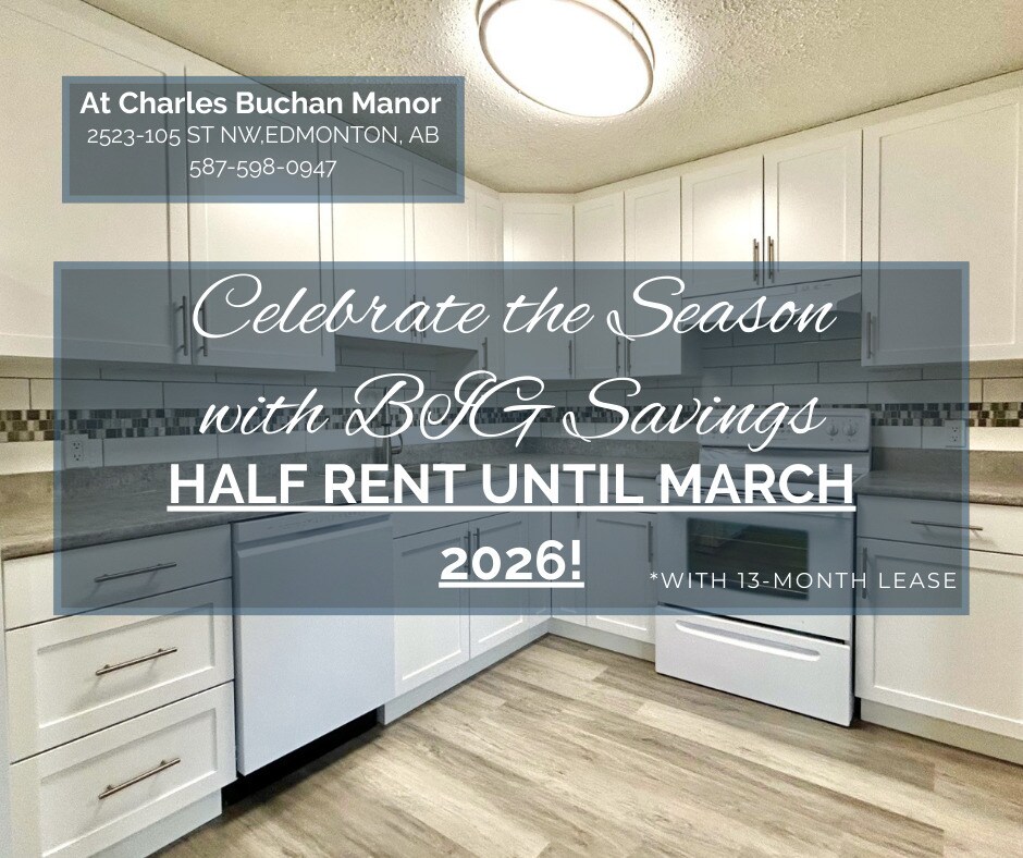 **NO UTILITIES** Enjoy spacious living in renovated units at Charles Buchan Manor, featuring a large kitchen and dining area, laminate flooring, and 3 appliances (dishwasher, fridge, stove). The building offers professional on-site management and energized parking stalls. Conveniently located near popular restaurants, shopping centers, grocery stores, parks, and major bus routes right outside. Images shown are for advertisement purposes only and may not reflect the exact unit layout. *Rent listed applies when signing a 12-month lease.