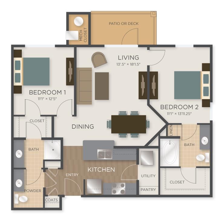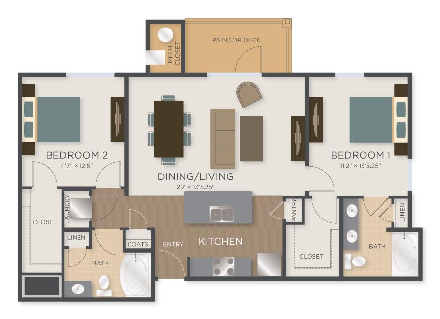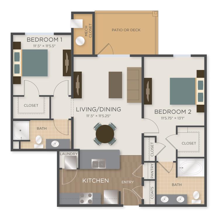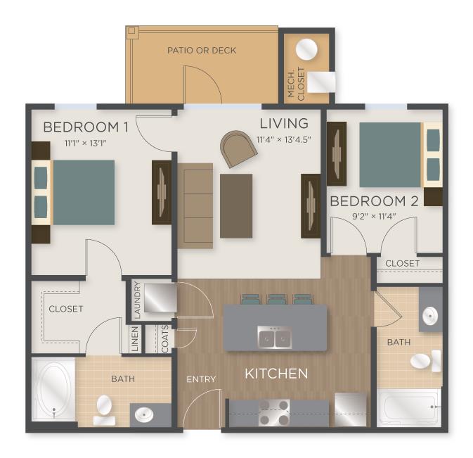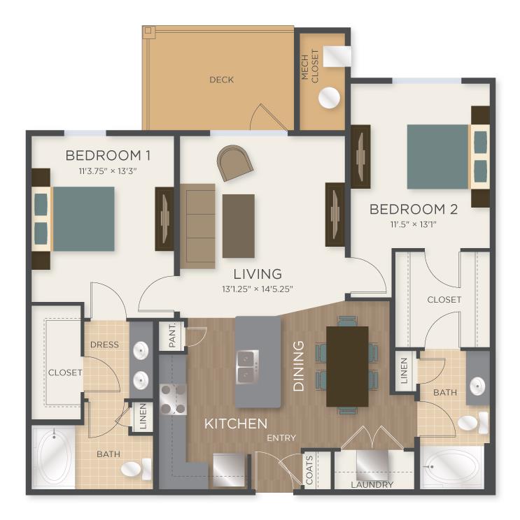 2 Beds, 2 Baths, 1302 sq ftLargest 2 BedroomThis is the largest 2 Bedroom at this PropertyModel Gallery