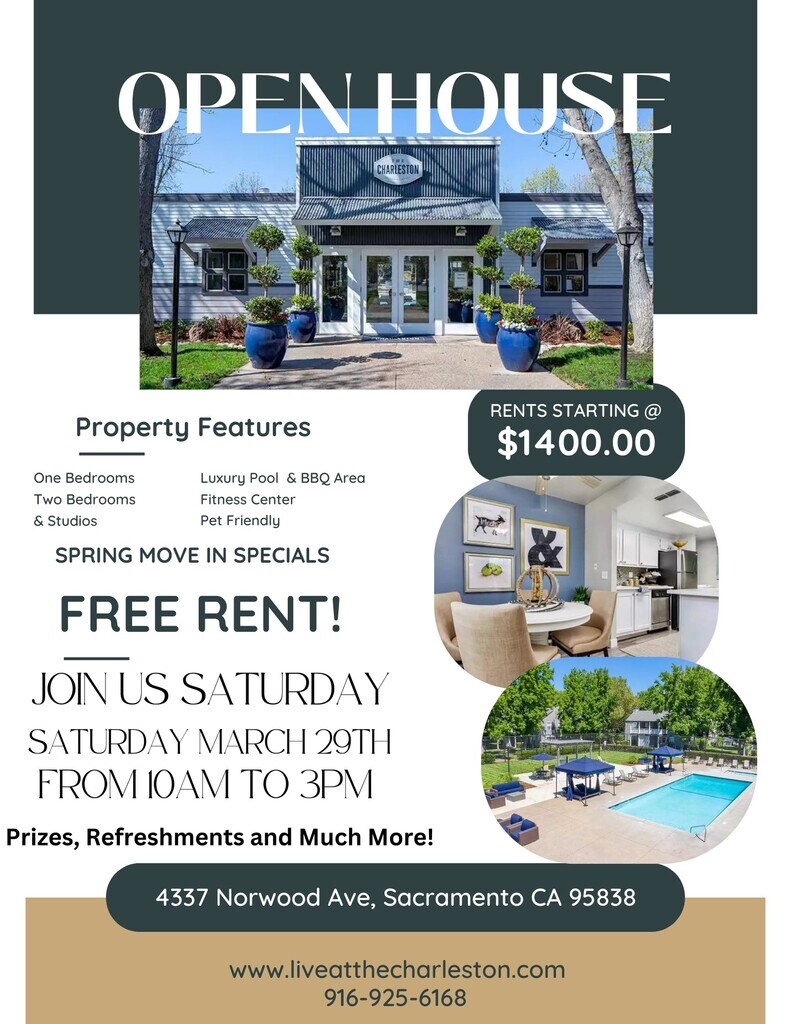 Enjoy The Charleston Apartment's country courtyard setting and ideal proximity to nearby Truxel Promenade, downtown Sacramento, Old Town Sacramento and Sacramento International Airport. Select apartment homes feature ceiling fans, custom designer paint colors of your choice, built-in microwaves, Berber-style carpet and more! Select homes also offer fireplaces and large patios. Apartment amenities include gas ranges, central heating and air conditioning, dishwasher and washer and dryer in every home. Charleston Apartments are designed with you in mind. Spacious 1 & 2 bedrooms are available now! Our community features a fitness center, business center with free computer use and internet, free DVD rentals, tennis courts with free equipment rentals, assigned covered parking, resort-style swimming pool, spa, gated community and professional on-site management. We look forward to meeting you! Call or email today. Don't wait. Apartments Management Consultants, Broker License # 01525033