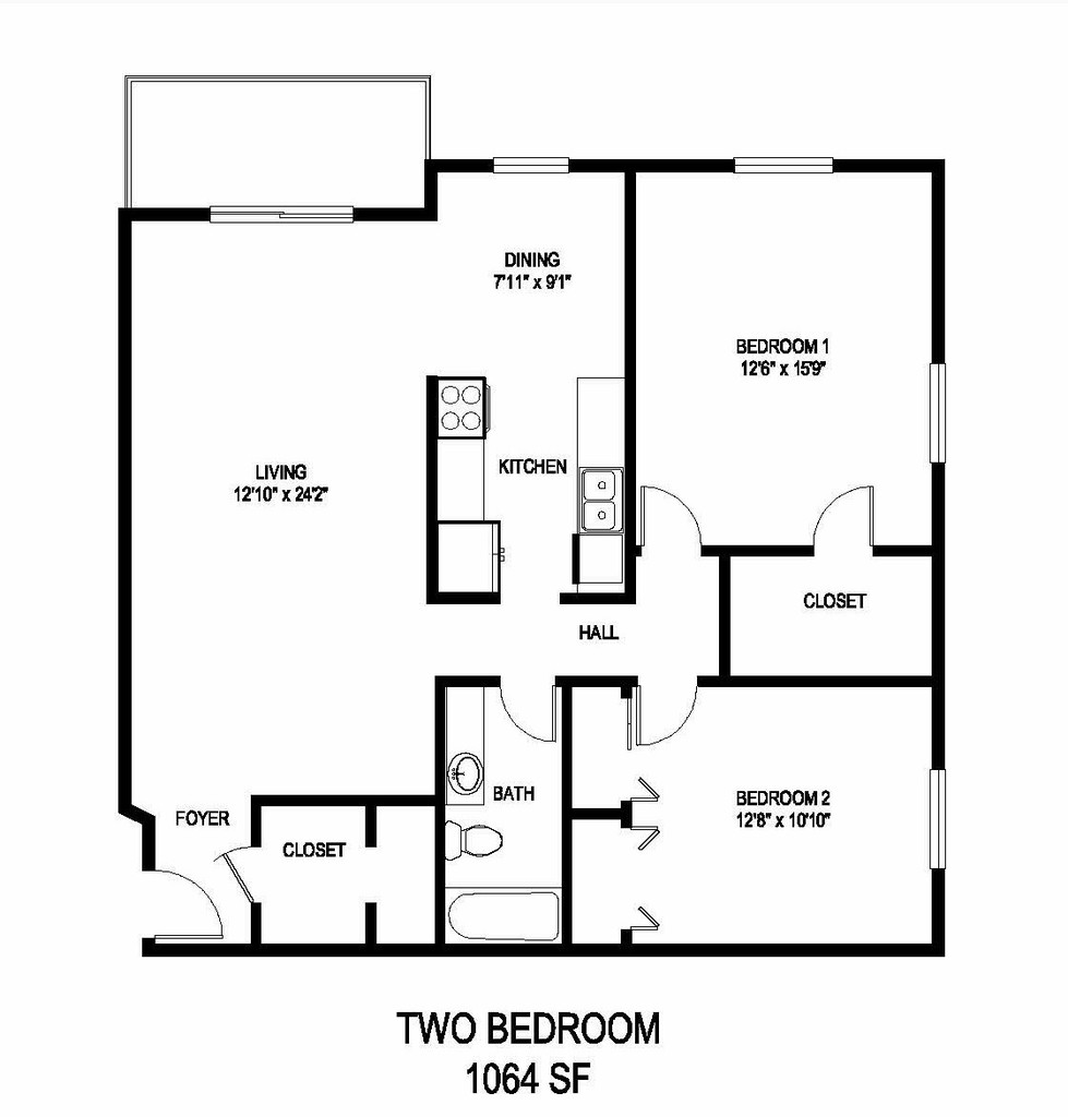 - 2 Bedrooms- Burgundy2 Beds, 1 Bath, 1064 sq ft- Model Gallery- Floorplans- Availability Details- Availability Date - Unit - Sq Ft - Call for Availability - Burgundy - 1064 sq ft - Model Amenities and Features- Features- Air Conditioning