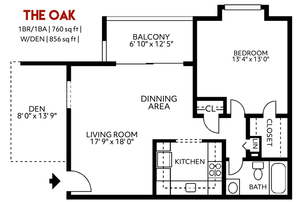 Apartment Model: The Oak with Den Classic$1,0791 Bedroom, 1 Bath, 856 sq ftUnavailableFloorplansPhotos![]()