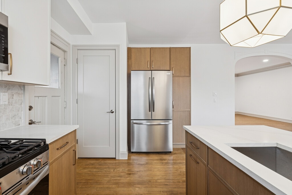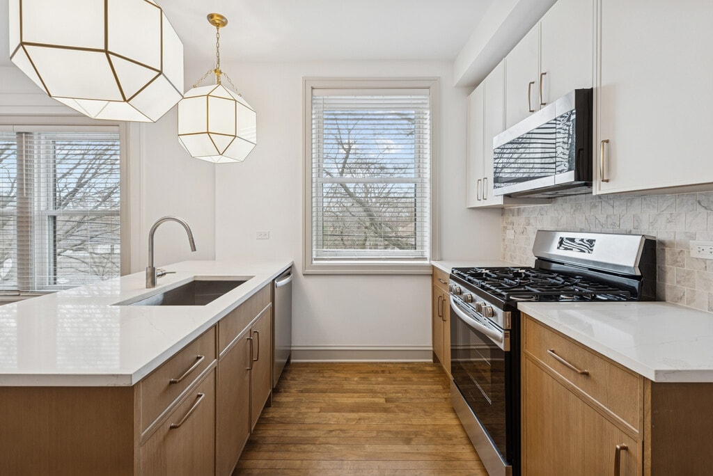 *VIRTUAL AND IN-PERSON TOURS AVAILABLE* The storied "Cheltenham Court Mansions" have seamlessly combined its timeless charm with the sophistication of modern, top-tier finishes. Located on a quiet, tree-lined street, these ENORMOUS apartments feature open-concept layouts with soaring ceilings, elegant crown molding, and real hardwood floors throughout. Oversized windows bathe the home in natural light during the day, and premier lighting selections from Visual Comfort brighten every room in the evening. Whether you're hosting, working from home, or simply relaxing, you'll have space to spread out and live comfortably in every corner of this expansive residence. With oversized bedrooms and full bathrooms (some of which are on-suite), these apartments offer the kind of space that truly feels like a home. They're ideal for families, roommates, or anyone seeking refined, spacious living. At the heart of the home is a chef’s kitchen designed with custom cabinetry, dramatic quartz countertops with bold veining, and a full suite of stainless steel appliances. A spacious peninsula provides the perfect gathering place for casual meals or entertaining, accented by designer pendant lighting and ornate ceiling medallions. In the adjacent dining room, it's large enough to fit a table of any size comfortably. Each bedroom comfortably fits a queen or king bed, has well-sized closets, and still offers plenty of space for dressers and a desk. Each bathroom evokes a spa-like experience with thoughtfully selected tiles, quartz-topped vanities, refined plumbing fixtures, and warm wall sconces that bring both brightness and elegance. 531–539 Hinman Ave is ideally located just 0.1 miles from Chicago Avenue and the South Blvd Purple Line, with additional access to the Main Street Purple Line and the Main UP-N Metra Station less than half a mile away. You’re also within walking distance to the lakefront, local parks, Trader Joe’s, Whole Foods, and the vibrant shops and restaurants of the Main-Dempster Mile. Northwestern University is just 1.5 miles north. This is a rare opportunity to enjoy the luxury of new construction in one of Evanston’s most historic and desirable neighborhoods. Contact us to schedule your tour today!