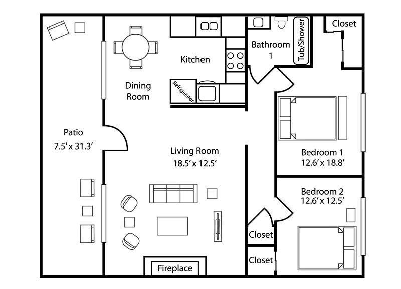 2 Beds, 1 Bath, 815 sq ftModel Gallery