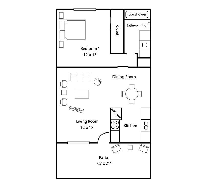 1 Bed, 1 Bath, 615 sq ftAvailable NowModel Gallery