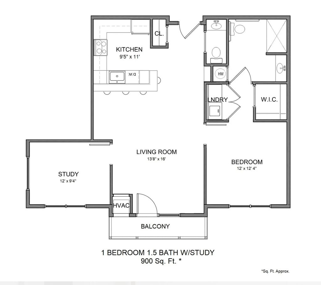 1 Bedroom 1.5 Bath w/Study - Floorplan 1 2 Bedrooms