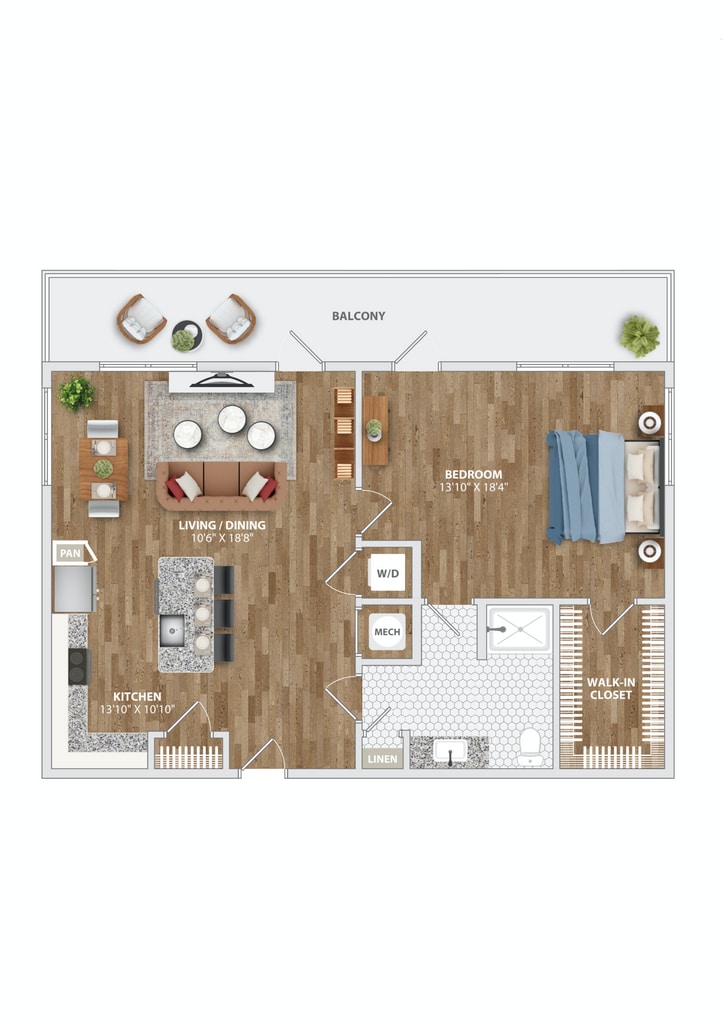 MILL A13 - Floorplan 1 Apartment Unit: 102MApartment Model: MILL A13$3,7131 Bedroom, 1 Bath, 1048 sq ftAvailable November 7, 2025Floorplan A1