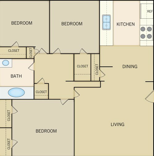 Apartment Model: 3 Bedroom 1 BathroomFrom $1,2753 Bedroom, 1 Bath, 895 sq ftAvailable Now![]()