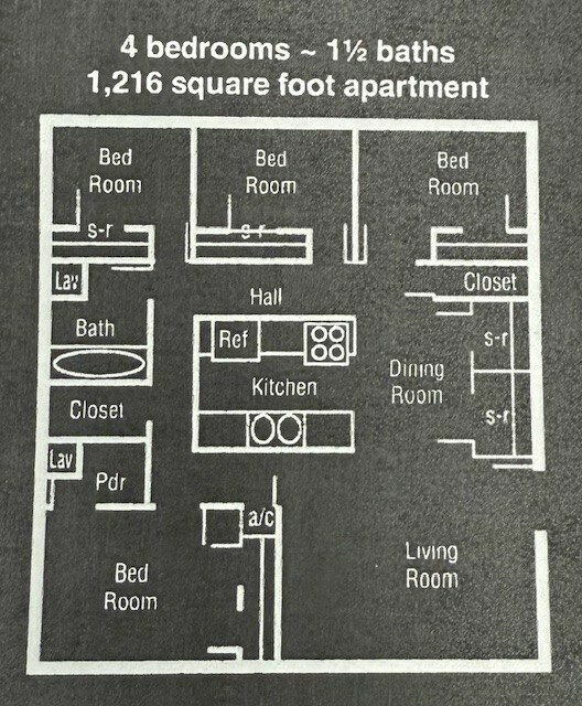 Apartment Model: 4 Bedroom 1.5 BathroomCall For Rates4 Bedroom, 1.5 Bath, 1216 sq ftUnavailable![]() - 4 Bedroom 1.5 Bathroom - Floorplan 1