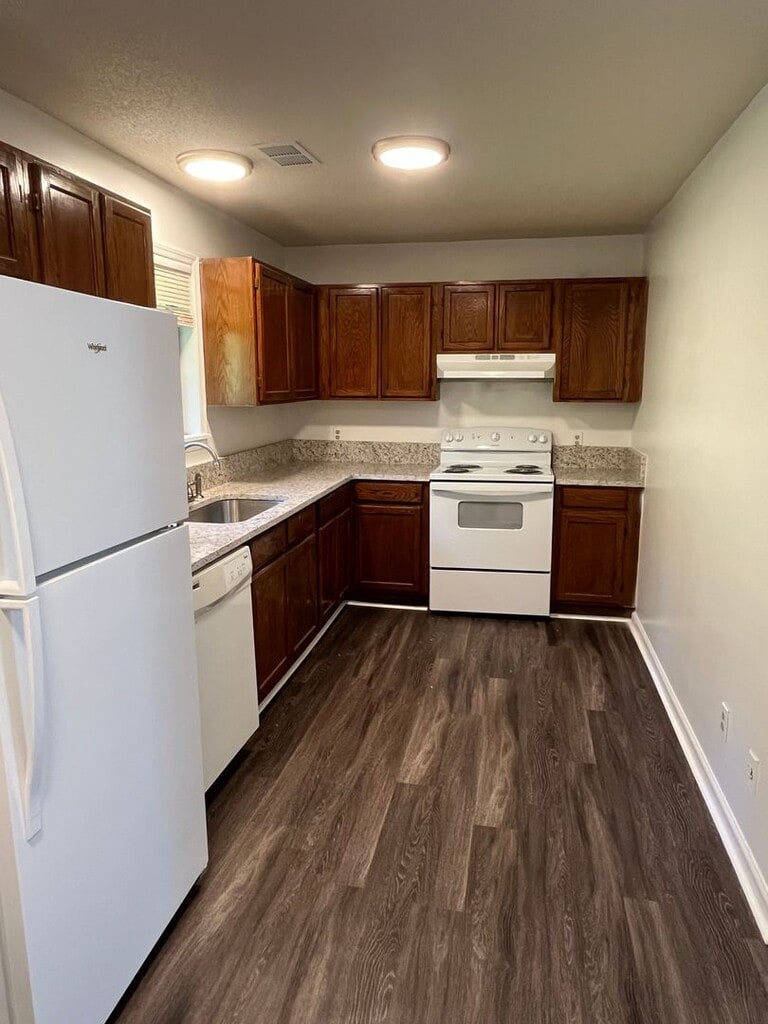 Additional monthly pass throughs of $60 Water, $10 Trash, $5 Pest Control.1 bedroom 1 bathroom flat unit. Unit has plank flooring throughout the main living areas and carpet in the bedroom. The kitchen has granite countertops, tile backsplash and white cabinets, plus all appliances: refrigerator, stove and dishwasher. Our apartments come with a large walk-in laundry room with hookups and washer/dryer units available upon request. Walking distance to Walmart, Starbucks and other restaurants. Community includes a pool, pet waste stations & recent apartment updates.