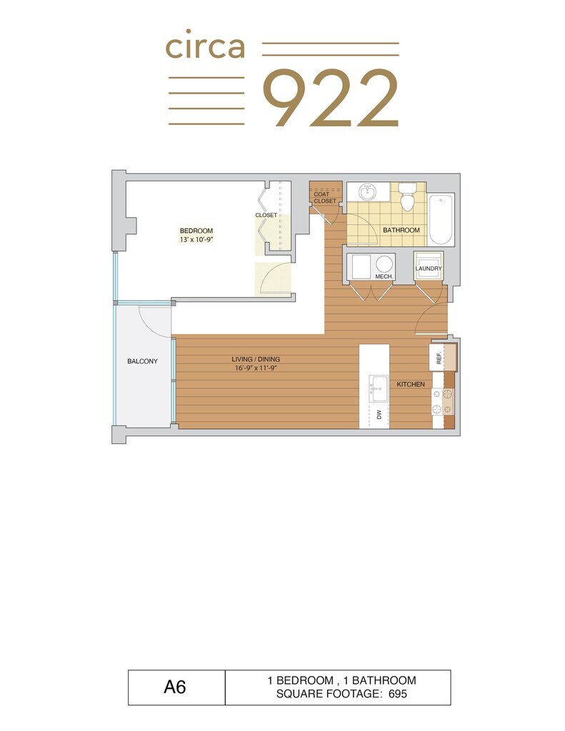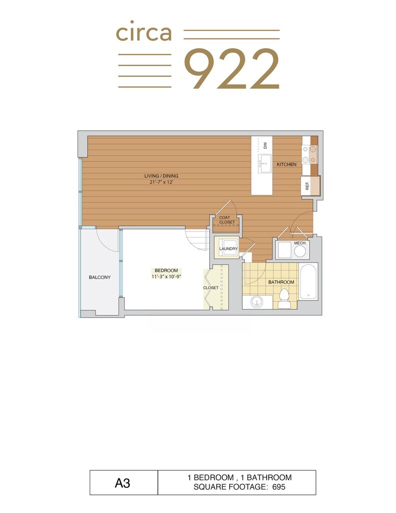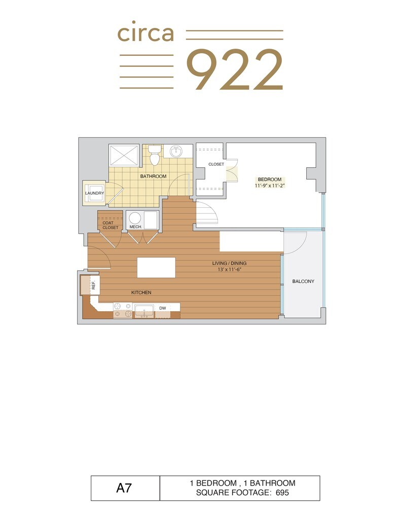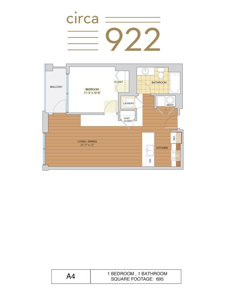 A4 - Floorplan 1 Apartment Unit: 1013Apartment Model: A4$2,8881 Bedroom, 1 Bath, 695 sq ftAvailable NowFloorplan A9