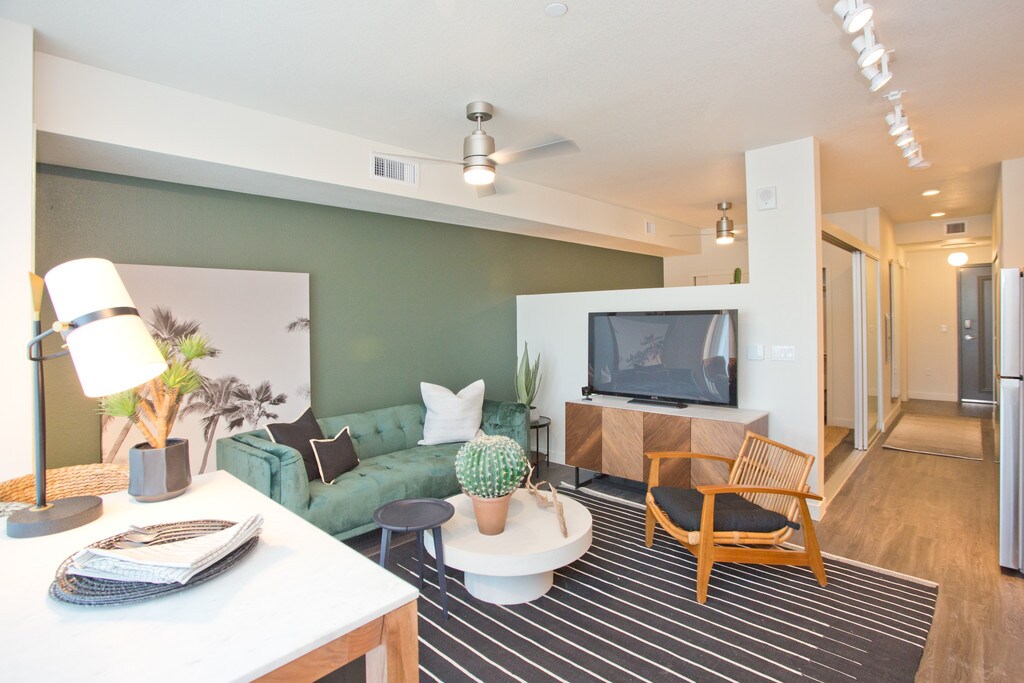 An exciting new chapter begins as soon as you take your pick from our studio, one, and two-bedroom apartments. Lifes essential amenities and extra comforts are included from the get-go, providing a canvas you are free to personalize as you see fit. Some of these highlights include keyless entry, designer plank flooring, private patios/balconies, as well as upgraded kitchens and in-unit washers and dryers. You will be just as captivated by the fabulous rooftop deck with Phoenix skyline views, firepits and our refreshing pool. Other amenities include our dog park, EV charging stations, the state-of-the-art fitness center with Fitness on Demand, and the modern resident clubhouse/ business center.