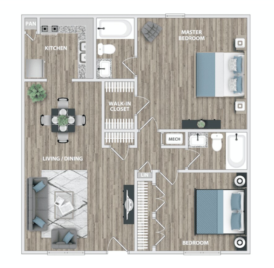 2 Beds, 1 Bath, 808 sq ftAvailable NowModel Gallery