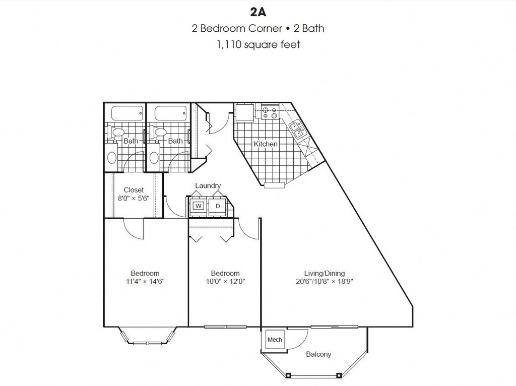 2A - Floorplan 2 Apartment Unit: 116Apartment Model: 2A$2,0672 Bedroom, 2 Bath, 1110 sq ftAvailable NowFloorplan 2B