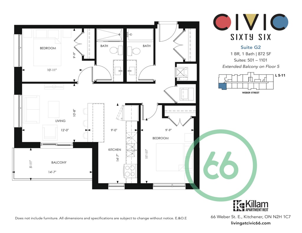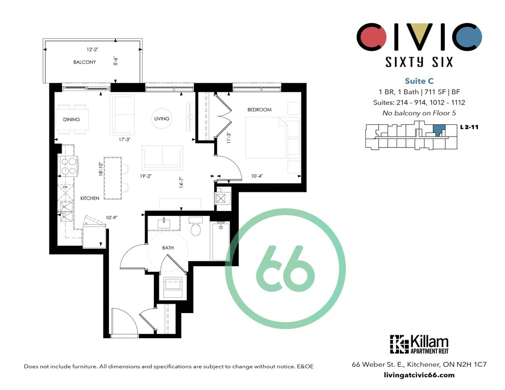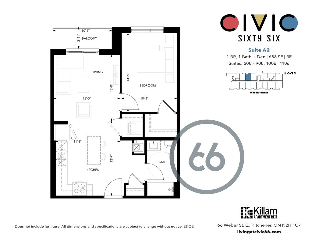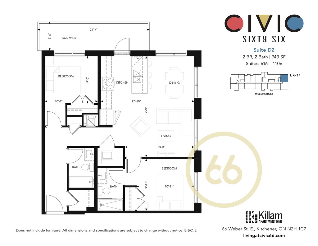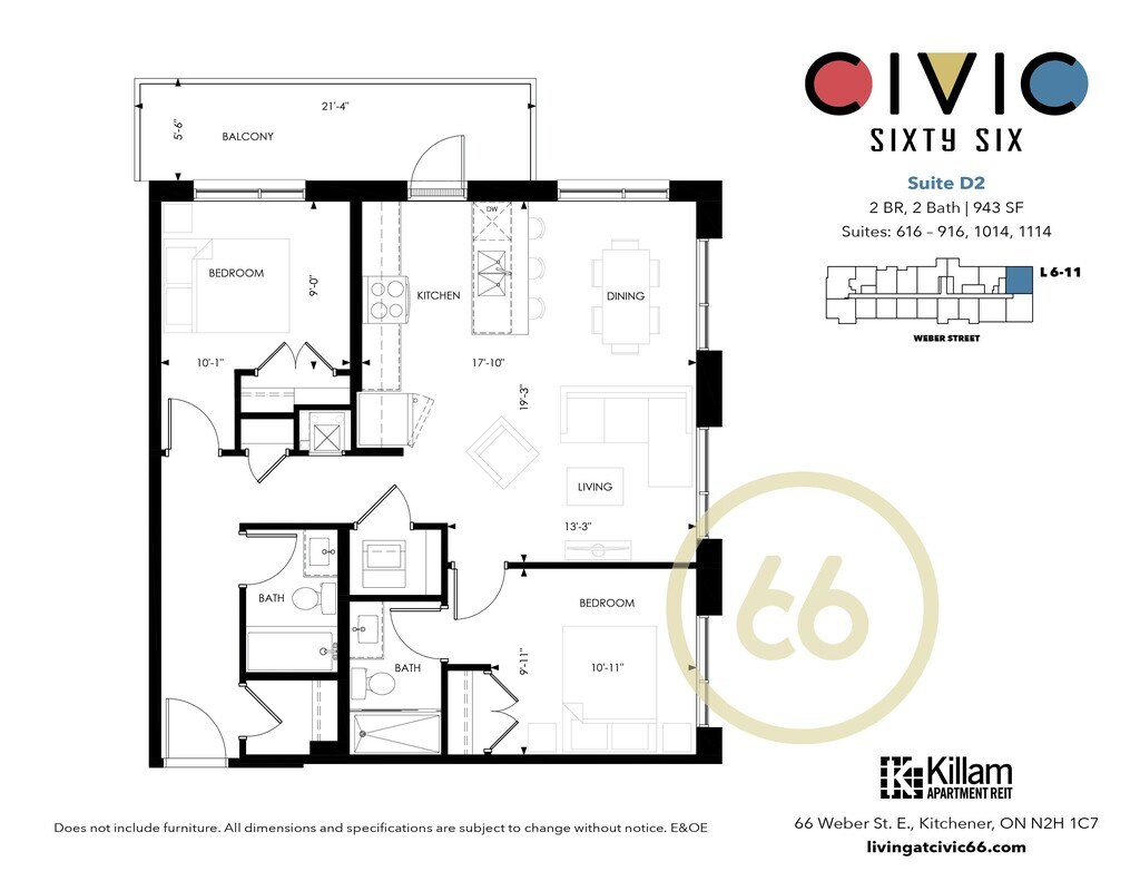 **Limited-Time Offer: Move In Today & Dont Pay Rent Until February 1st, 2026! Contact Us For Details.** Welcome home to the cool comfort at Civic 66, where everything you love and more is just around the corner. By preserving two historic buildings on either side of the property, the 11-storey residence In Kitchener, Ontario, enhances the area in a cohesive way. The central courtyard creates a place for community gathering, and the buildings adjacent preserve the neighbourhood feel. Welcome to your sanctuary. With thoughtful touches, modern appliances, and open-concept layouts, these suites will invite you to settle in. Warm wooden finishes balance out sleek interiors, creating a functional space to call home. Civic 66 offers a perfect mix of comfort and ease with secure package delivery, incredible soundproofing and state-of-the-art appliances. Never worry about being late to your class again. Lift, spin or stretch in the spacious fitness centre and yoga studio just an elevator ride away. Work from indoor common rooms or outdoor terraces, featuring lounge areas and premium amenities such as a kitchenette, library, and private and public seating. Effortless sustainable living. The building is equipped with earth-friendly features like solar panels, geothermal heating, and electric vehicle charging.