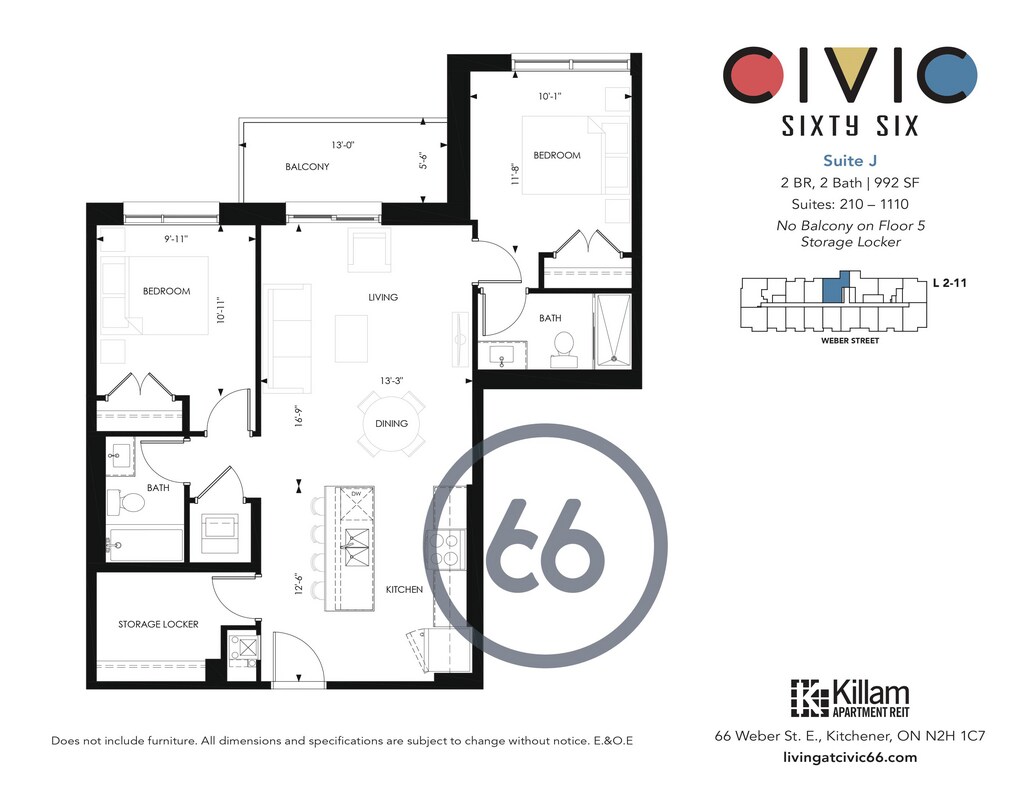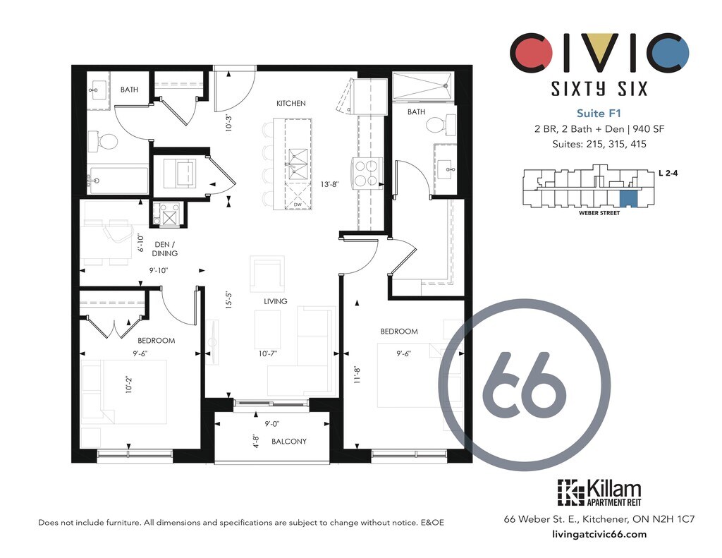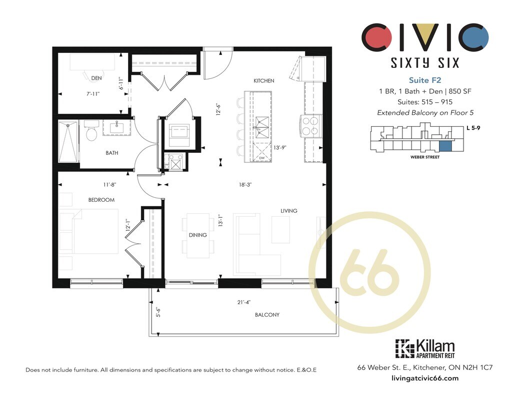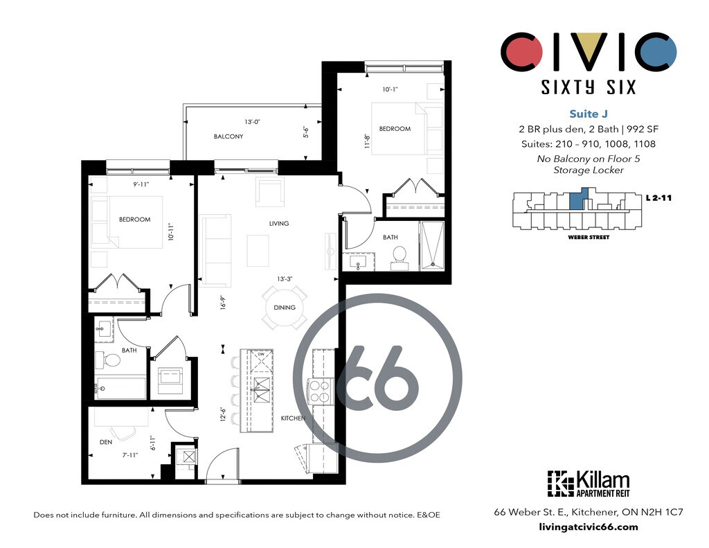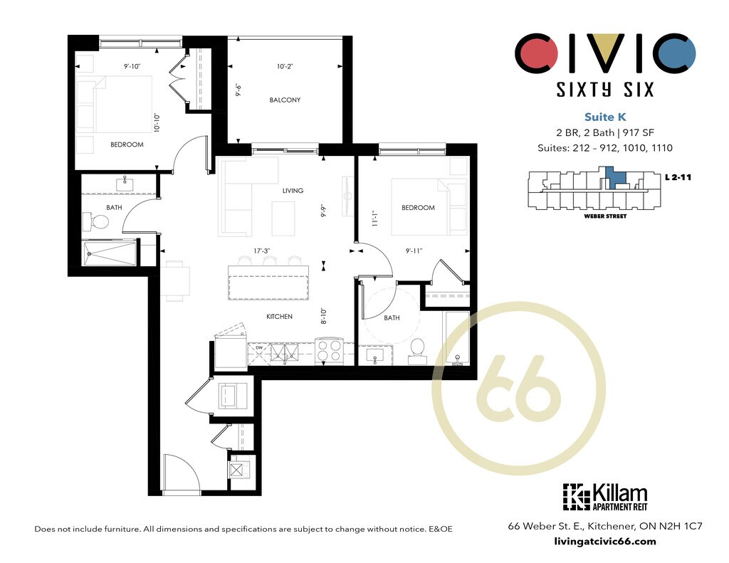 **Limited-Time Offer: Move In Today & Dont Pay Rent Until February 1st, 2026! Contact Us For Details.** Welcome home to the cool comfort at Civic 66, where everything you love and more is just around the corner. By preserving two historic buildings on either side of the property, the 11-storey residence In Kitchener, Ontario, enhances the area in a cohesive way. The central courtyard creates a place for community gathering, and the buildings adjacent preserve the neighbourhood feel. Welcome to your sanctuary. With thoughtful touches, modern appliances, and open-concept layouts, these suites will invite you to settle in. Warm wooden finishes balance out sleek interiors, creating a functional space to call home. Civic 66 offers a perfect mix of comfort and ease with secure package delivery, incredible soundproofing and state-of-the-art appliances. Never worry about being late to your class again. Lift, spin or stretch in the spacious fitness centre and yoga studio just an elevator ride away. Work from indoor common rooms or outdoor terraces, featuring lounge areas and premium amenities such as a kitchenette, library, and private and public seating. Effortless sustainable living. The building is equipped with earth-friendly features like solar panels, geothermal heating, and electric vehicle charging.