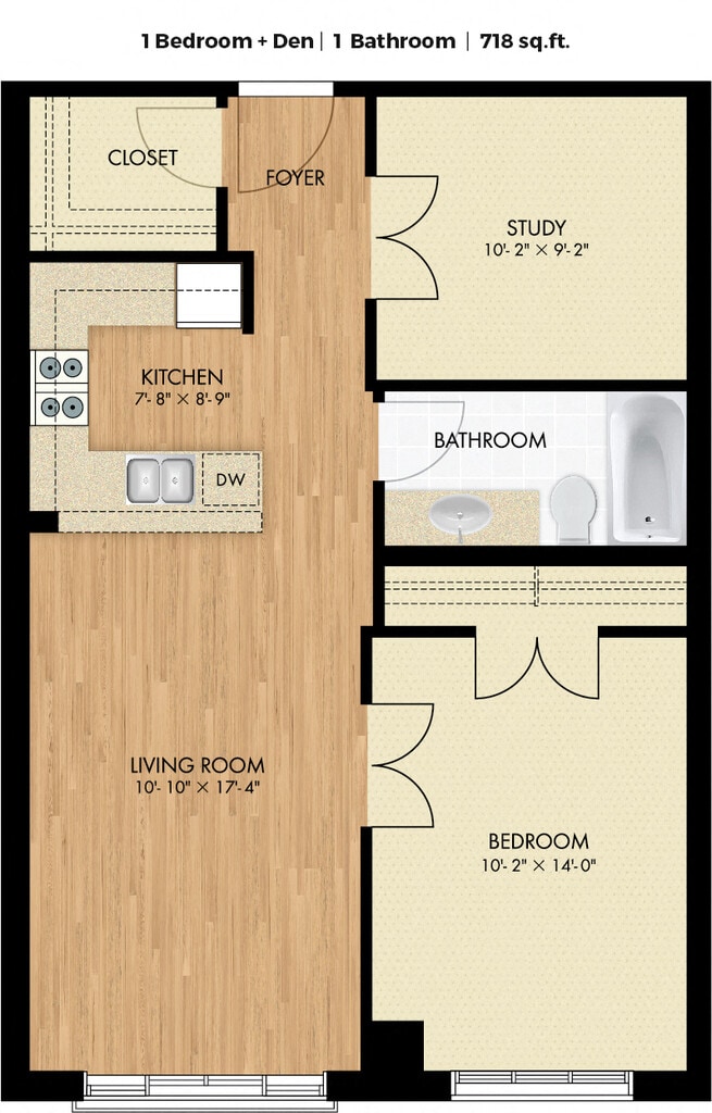 Apartment Model: 1 Bedroom plus Den 1 BathroomFrom $2,1671 Bedroom, 1 Bath, 718-817 sq ftAvailable Now![]()