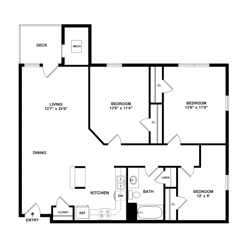 Apartment Model: 3 BD$2,4003 Bedroom, 1 Bath, 1148 sq ftUnavailable![]()