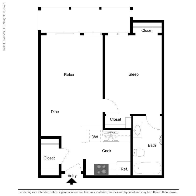 Medium 1 Bed 1 Bath - Floorplan 1 Floor plans are artist's rendering. All dimensions are approximate. Actual product and specifications may vary in dimension or detail. Not all features are available in every rental home. Prices and availability are subject to change. Base rent is based on monthly frequency. Additional fees may apply, such as but not limited to package delivery, trash, water, amenities, etc. Deposits vary. Please see a representative for details.