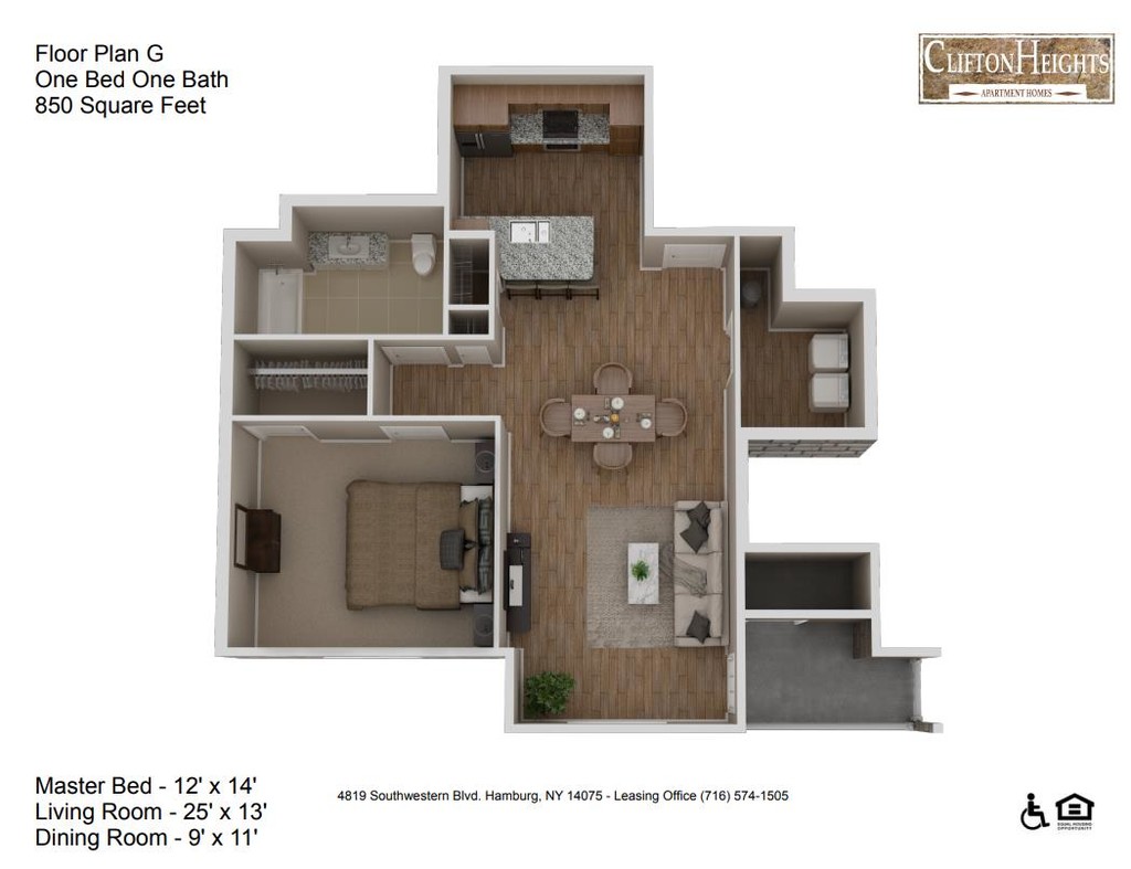 Apartment Model: 1G1 Bedroom, 1 Bath, 850 sq ftUnavailable![]()