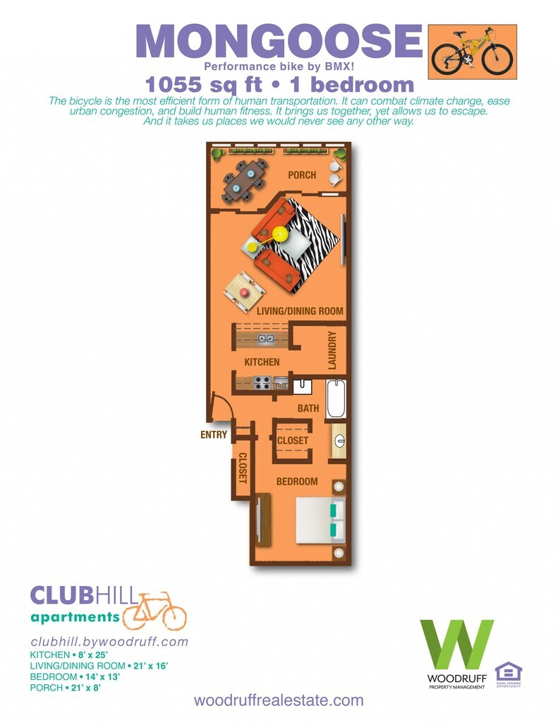 - 1 Bedroom- Mongoose Reno- From $1,2501 Bed, 1 Bath, 1055 sq ftAvailable Now- Model Gallery- Floorplans- Availability Details- Price - Availability Date - Unit - Sq Ft - Deposit - $1,250 - Available Now - T01 - 1055 - $500 - Unit T01 Amenities and Features- Features- Air Conditioning