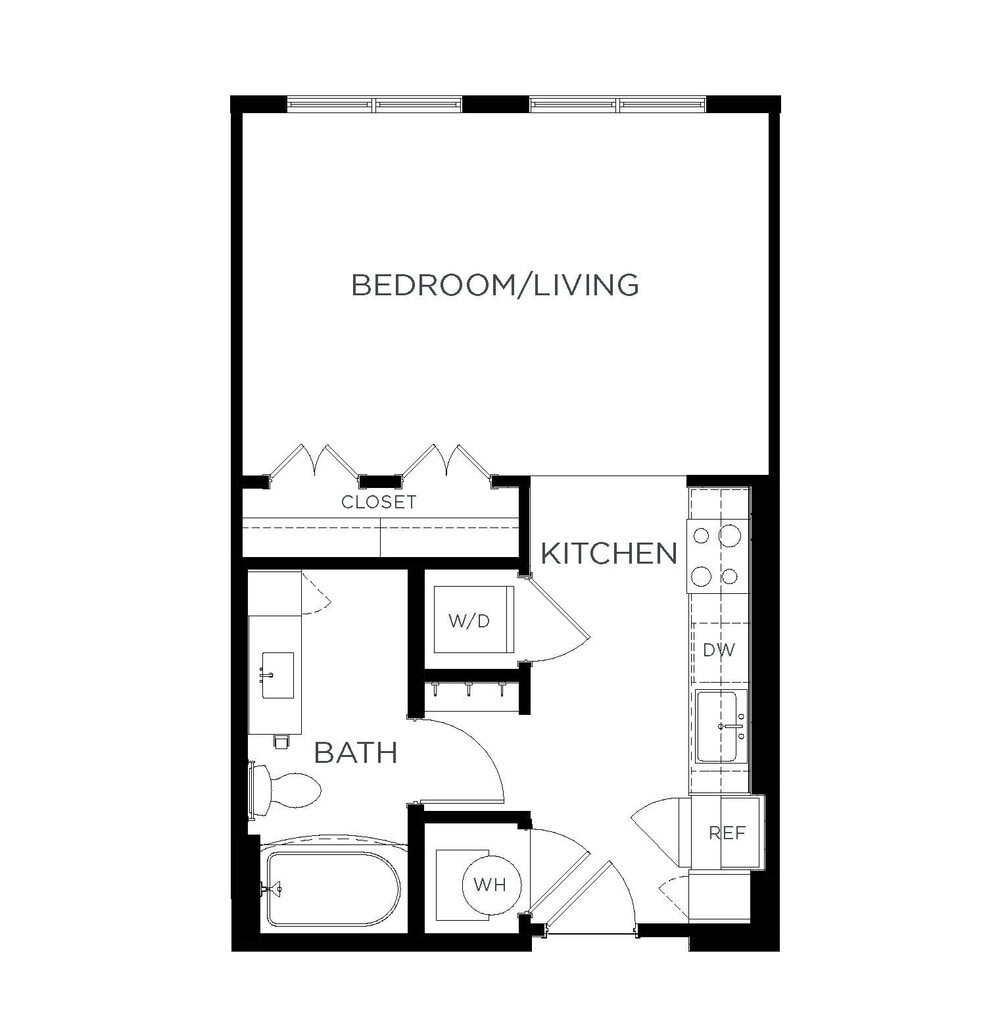 Studio - Floorplan 1 Floor plans are artist's rendering. All dimensions are approximate. Actual product and specifications may vary in dimension or detail. Not all features are available in every rental home. Prices and availability are subject to change. Base rent is based on monthly frequency. Additional fees may apply, such as but not limited to package delivery, trash, water, amenities, etc. Deposits vary. Please see a representative for details.