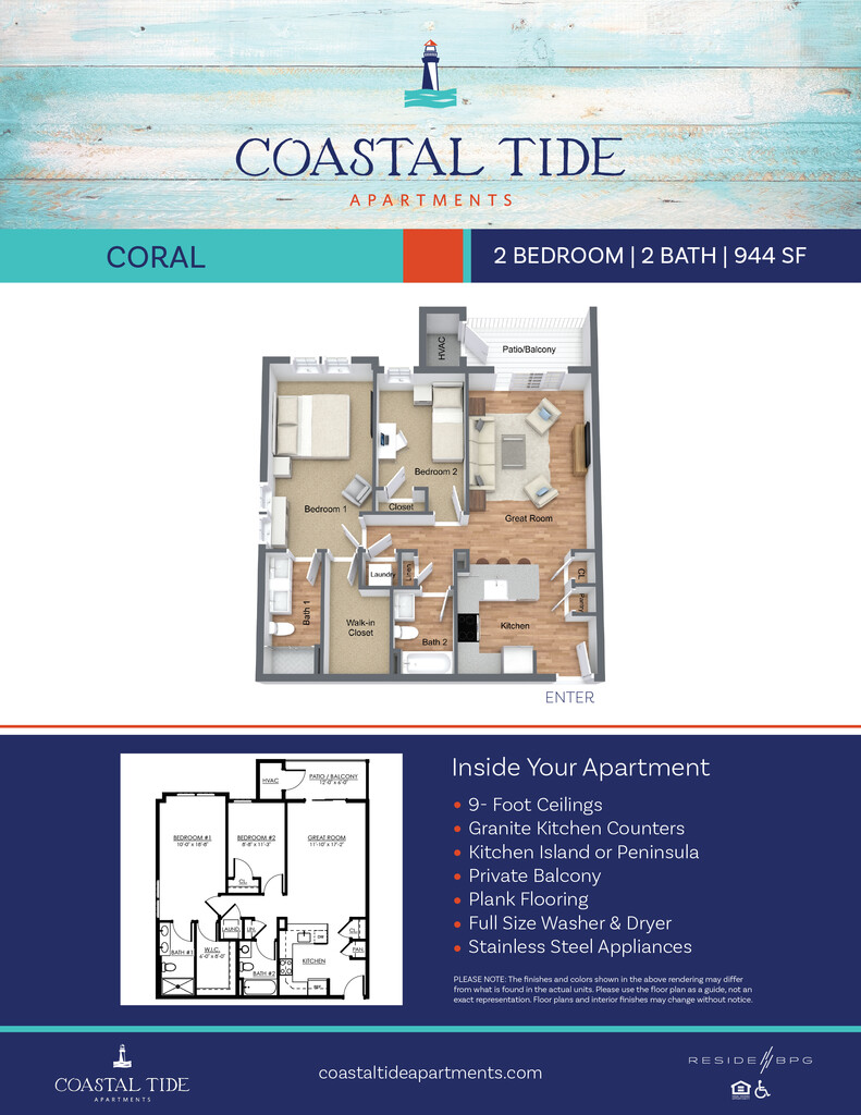 Price Availability Date Unit Sq Ft $1,869 Call for Availability Coral 944 sq ft Model Amenities and Features