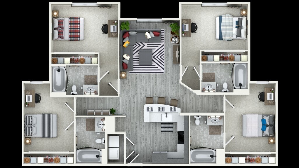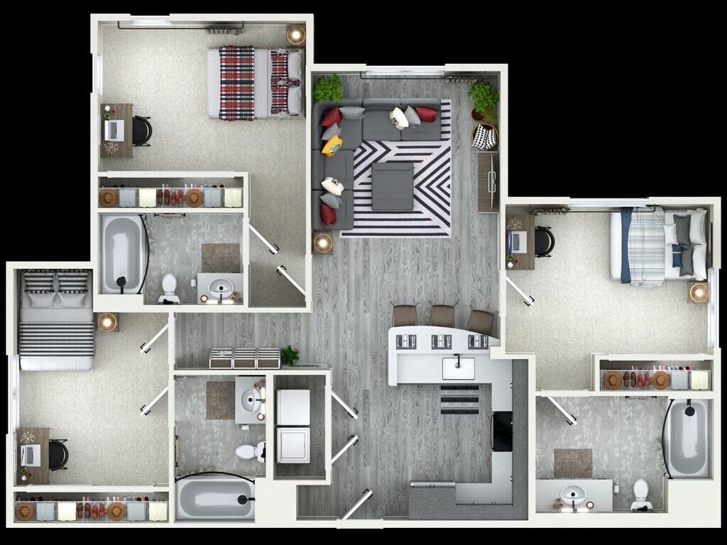 4x4 - Floorplan 1 Apartment Unit: Private BedroomApartment Model: 4x4$1,5804 Bedroom, 4 Bath, from 1477 sq ftAvailable NowApartment Unit: Private BedroomApartment Model: 4x4$1,5804 Bedroom, 4 Bath, from 1477 sq ftAvailable NowApartment Unit: Private BedroomApartment Model: 4x4$1,6204 Bedroom, 4 Bath, from 1477 sq ftAvailable August 11, 2026