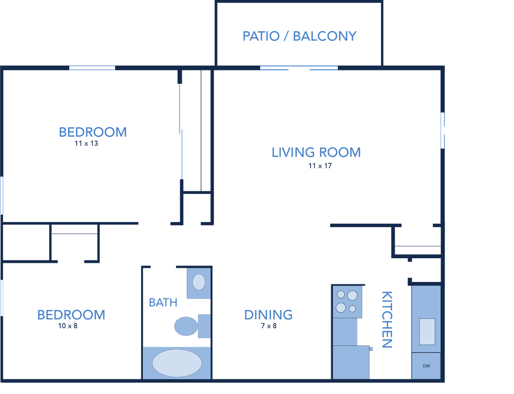 Apartment Model: 2 Bedrooms$1,1502 Bedroom, 1 Bath, 750 sq ftAvailable Now![]()