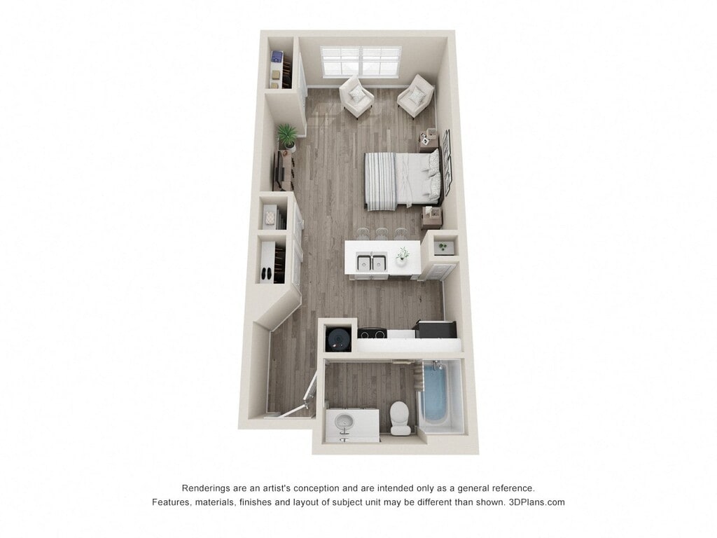 Apartment Model: S-2From $1,052Studio, 1 Bath, 430 sq ftAvailable NowFloor plans are artist's rendering. All dimensions are approximate. Actual product and specifications may vary in dimension or detail. Not all features are available in every rental home. Prices and availability are subject to change. Base rent is based on monthly frequency. Additional fees may apply, such as but not limited to package delivery, trash, water, amenities, etc. Deposits vary. Please see a representative for details.