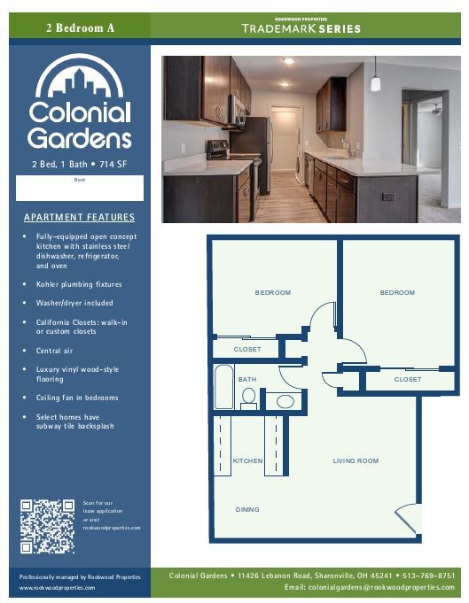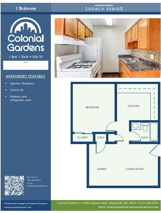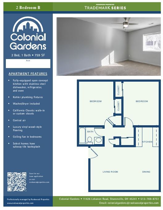 Beautiful property located just north of Sharonville. The property is nestled between the Sharonville Bike Path and Sharon Woods. Colonial Gardens has a beautiful courtyard with a glistening pool and playground. Most of our units have balconies. Our full renovated units have brand new stainless steel appliances, washer and dryer and new AC & Furnace heat. The property also has a laundry room on site and a brand new state of the art gym. We are located conveniently to both 75 and 275.