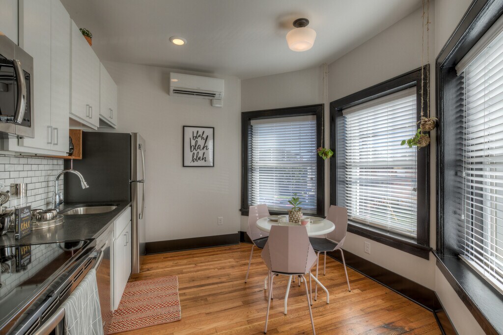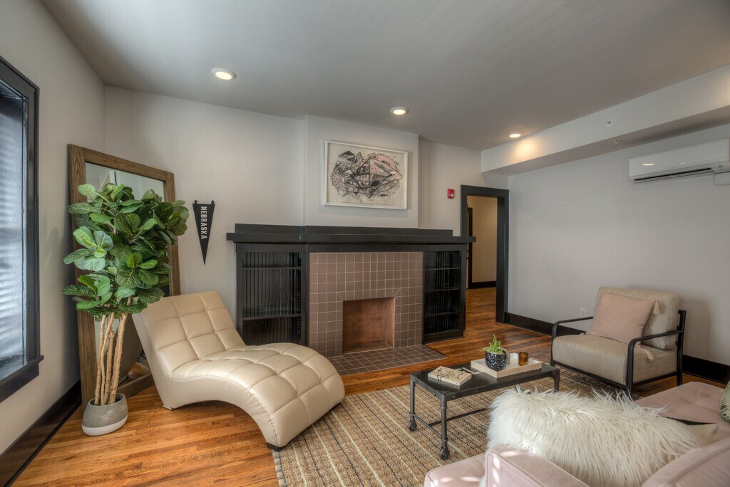 Views of downtown and the Blackstone District never looked better! Massive black wood framed windows provide a picturesque look into the urban environment where this historic home is situated. A separate kitchen space provides plenty of space for a culinary masterpiece, and a peaceful cup of coffee in the nook that could comfortably fit your coziest seat. Located in the heart of Omaha's historic Blackstone District, you'll be surrounded by classic brick storefronts, food, drinks and entertainment, all within walking distance.