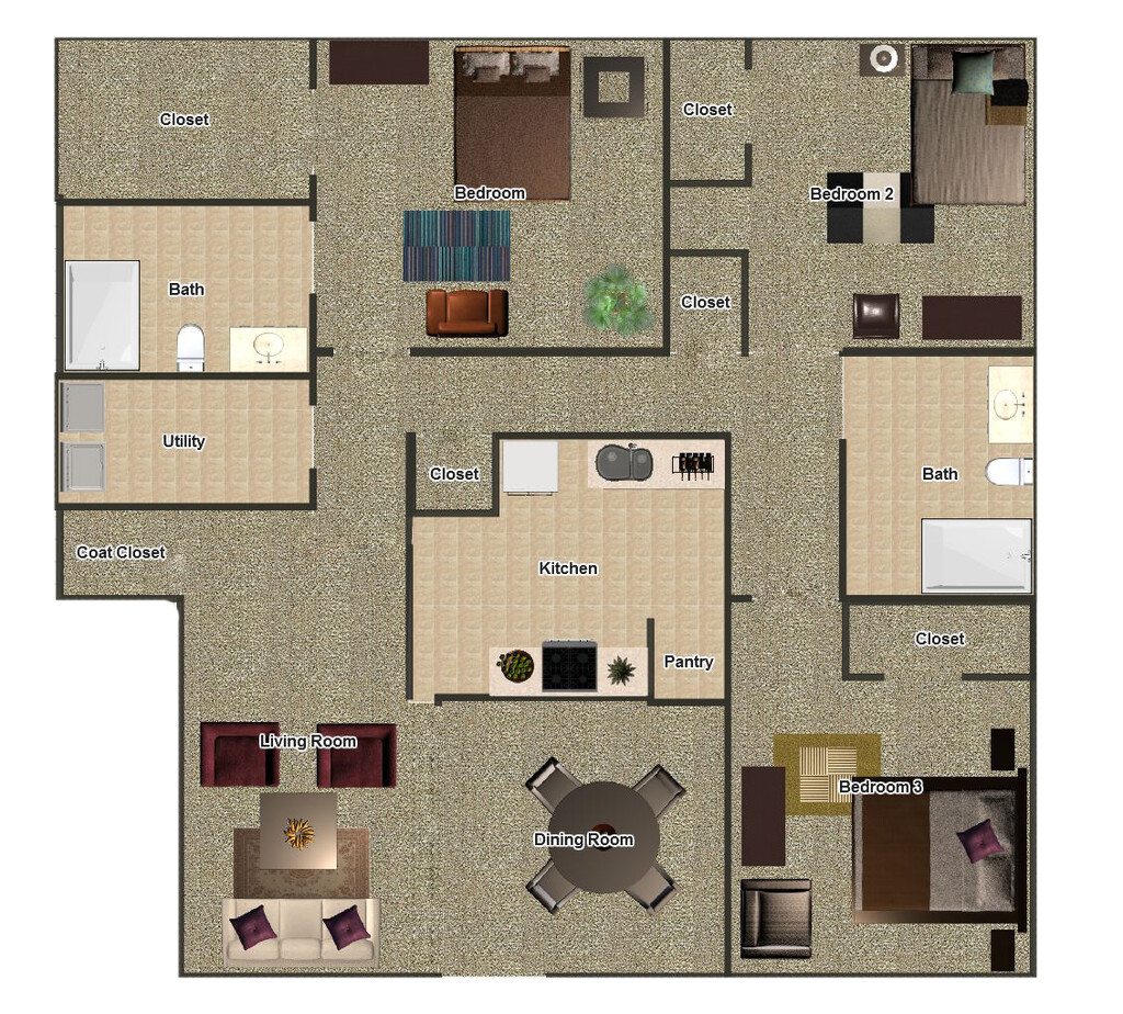 Apartment Model: Three Bedroom Two Bathroom$1,3503 Bedroom, 2 Bath, 1156 sq ftAvailable Now![]()