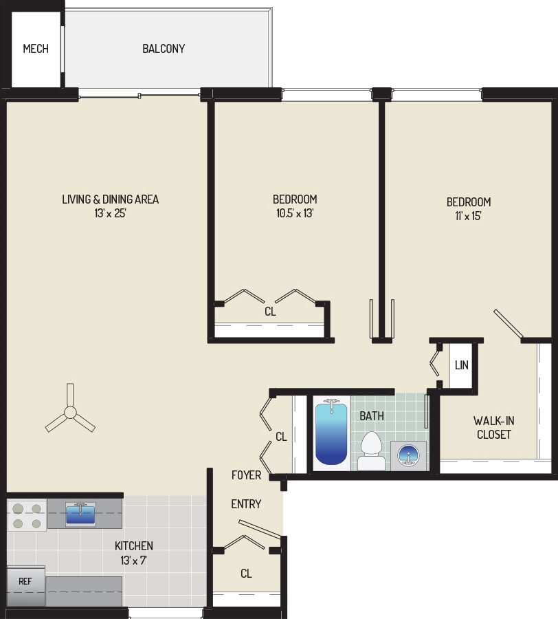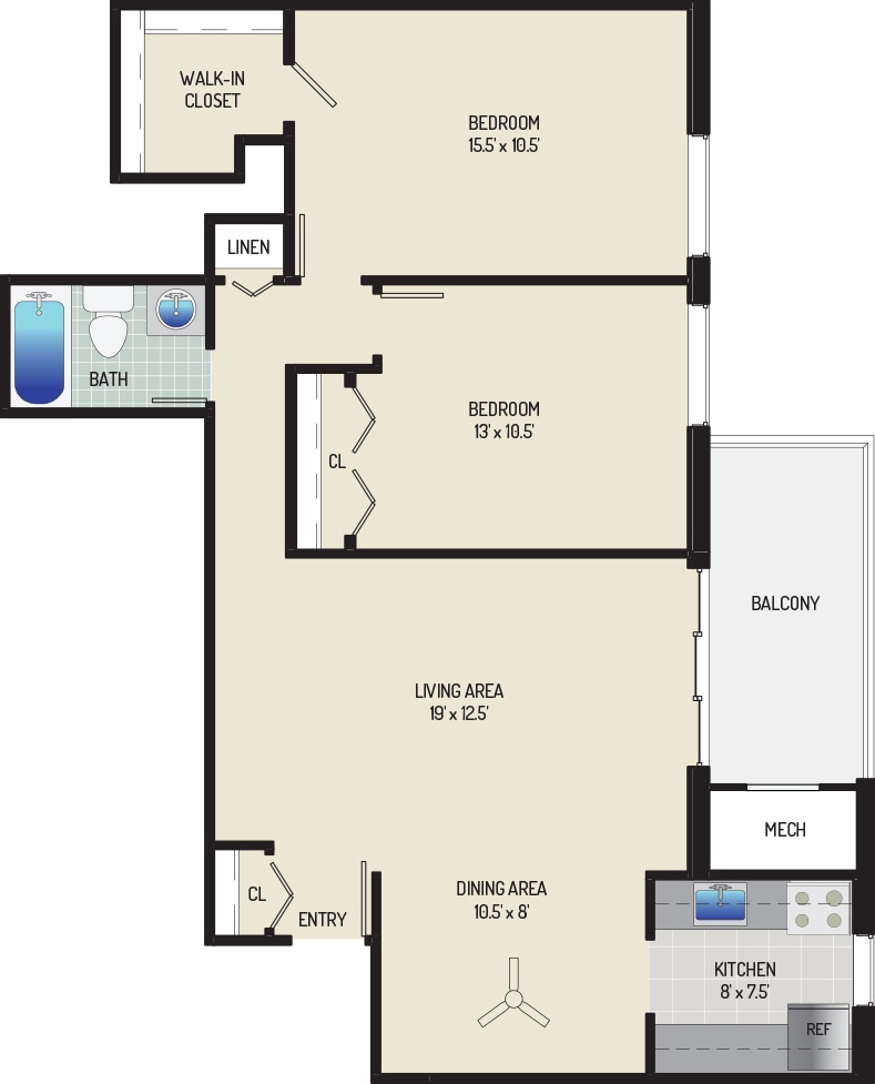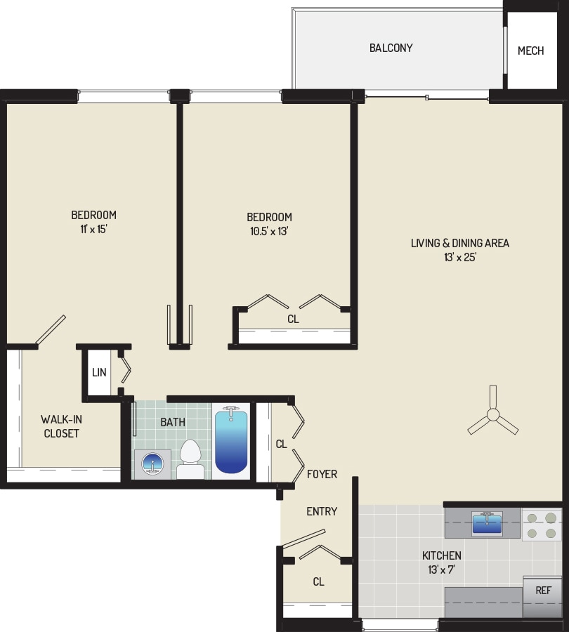 2 Bedrooms + 1 Bath - Floorplan 1 ![]()
