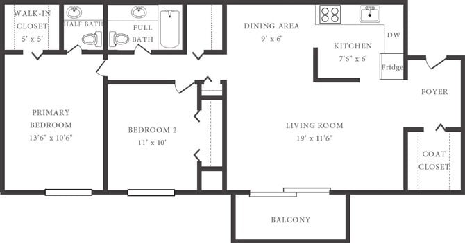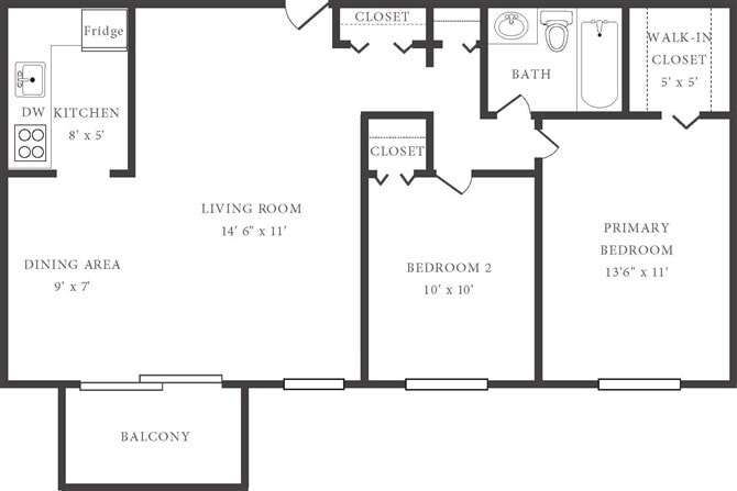 Apartment Model: 2 Bedroom 1 BathroomFrom $9062 Bedroom, 1 Bath, 800 sq ftAvailable Now![]()