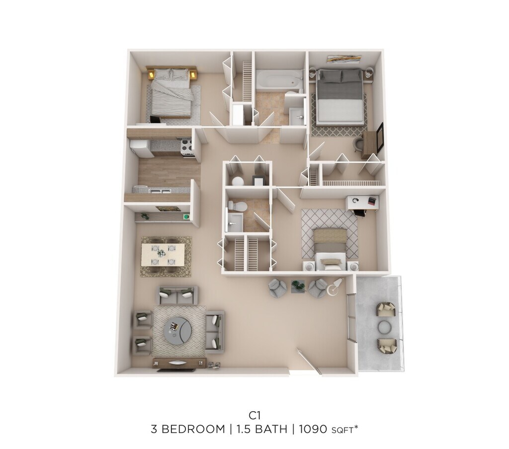 Apartment Model: Three Bed 1.5 Bath - 1090 SqftFrom $1,4153 Bedroom, 1.5 Bath, 1090 sq ftAvailable Now![]()