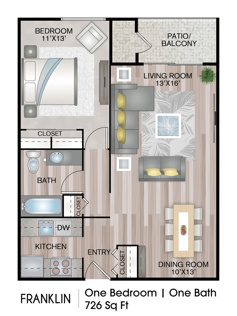 Franklin - Floorplan 2 Apartment Unit: 01-D315Apartment Model: FranklinFrom $1,6351 Bedroom, 1 Bath, 726 sq ftAvailable November 9, 2025Bentley