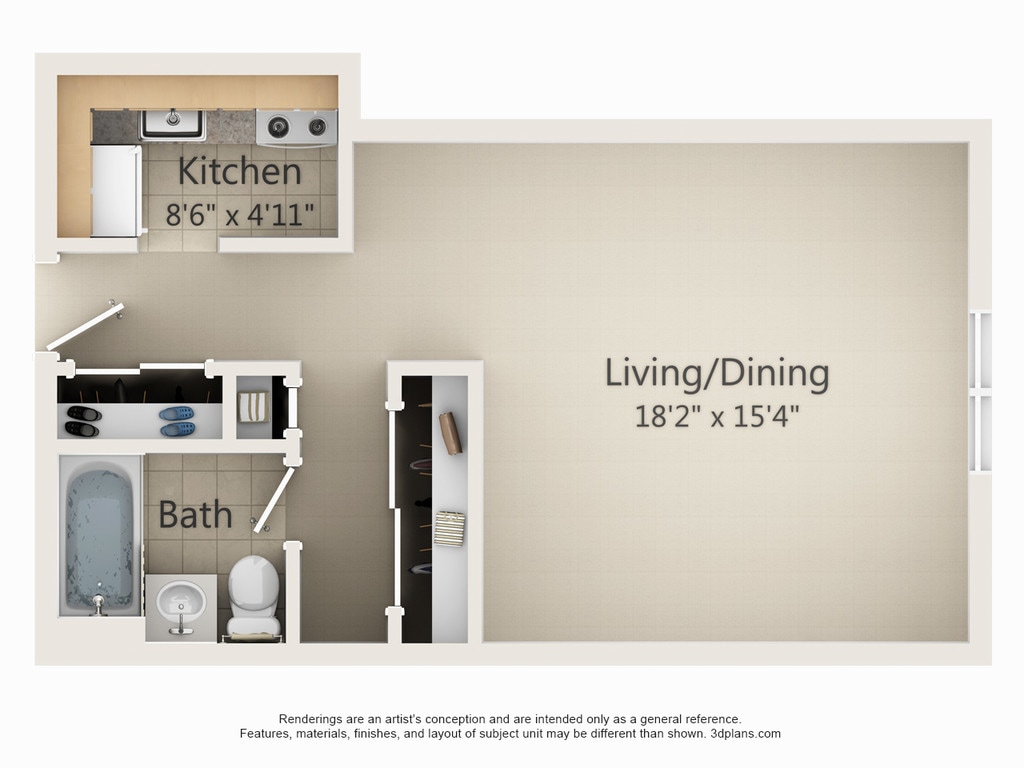Studio, 1 Bath, 500 sq ftAvailable NowModel Gallery