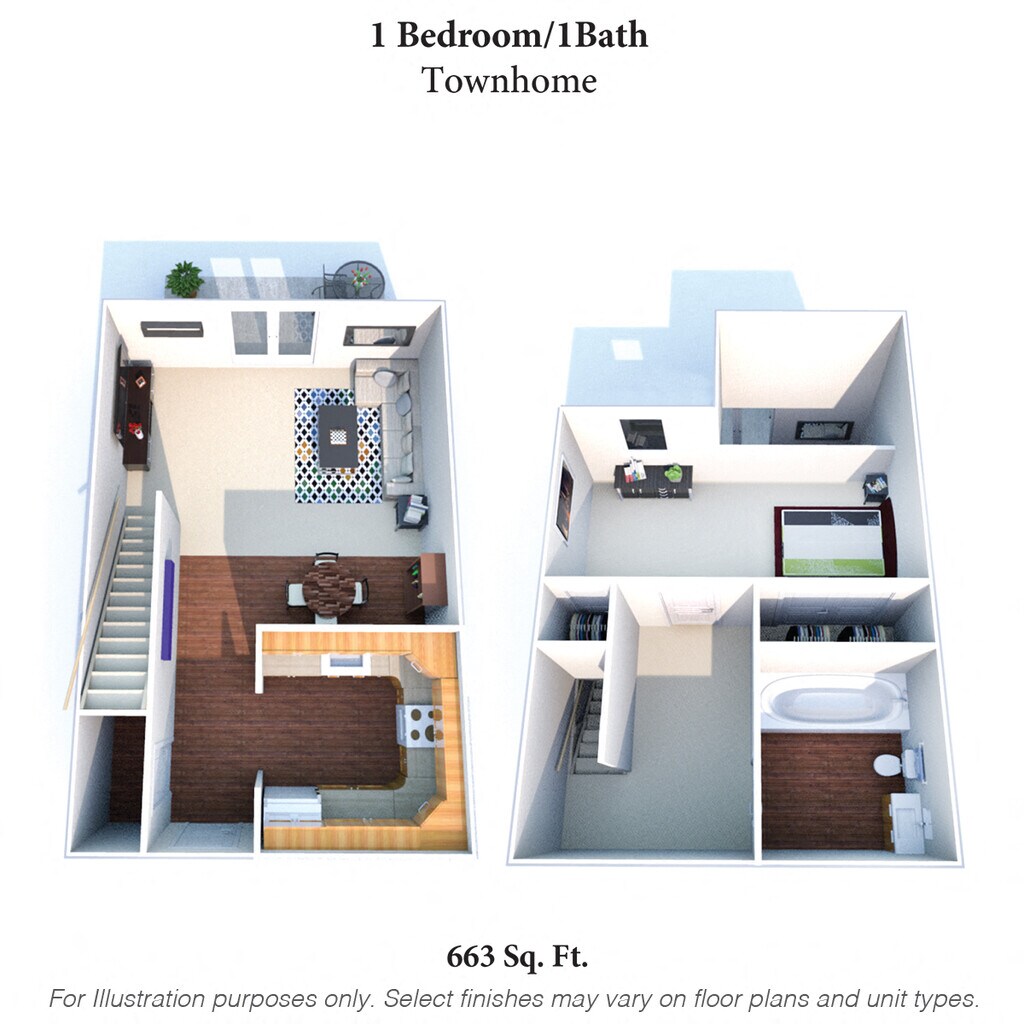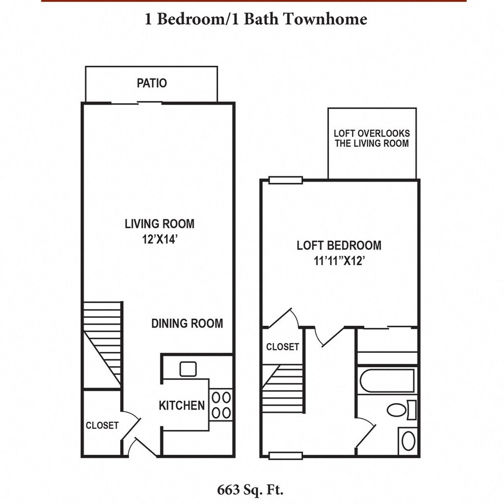 One Bedroom Townhome - 633SqFt - Floorplan 2 One Bedroom One Bath - 723SqFt
