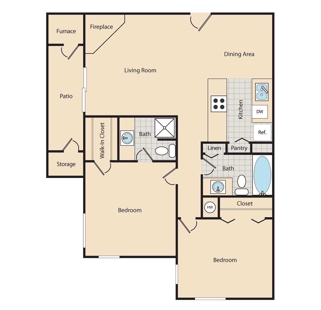 2 Beds, 1 Bath, 744 sq ftAvailable NowModel Gallery