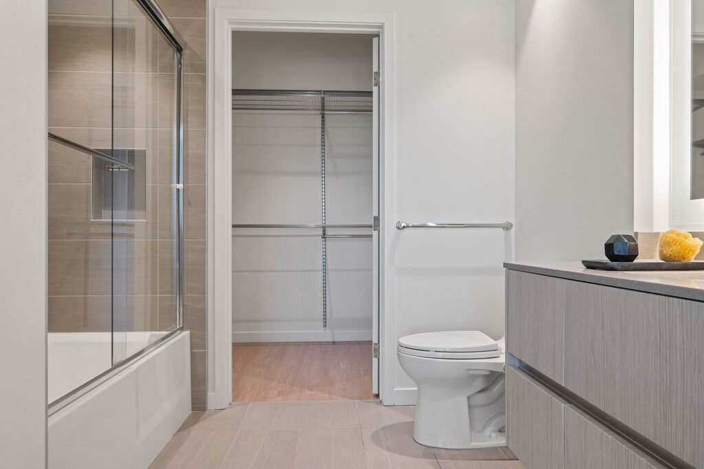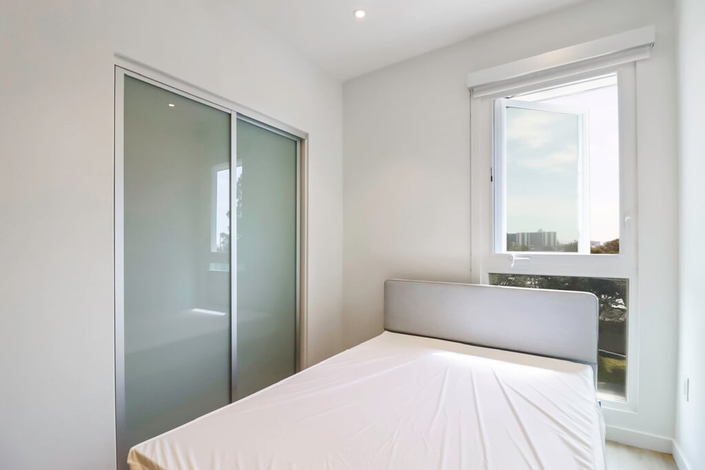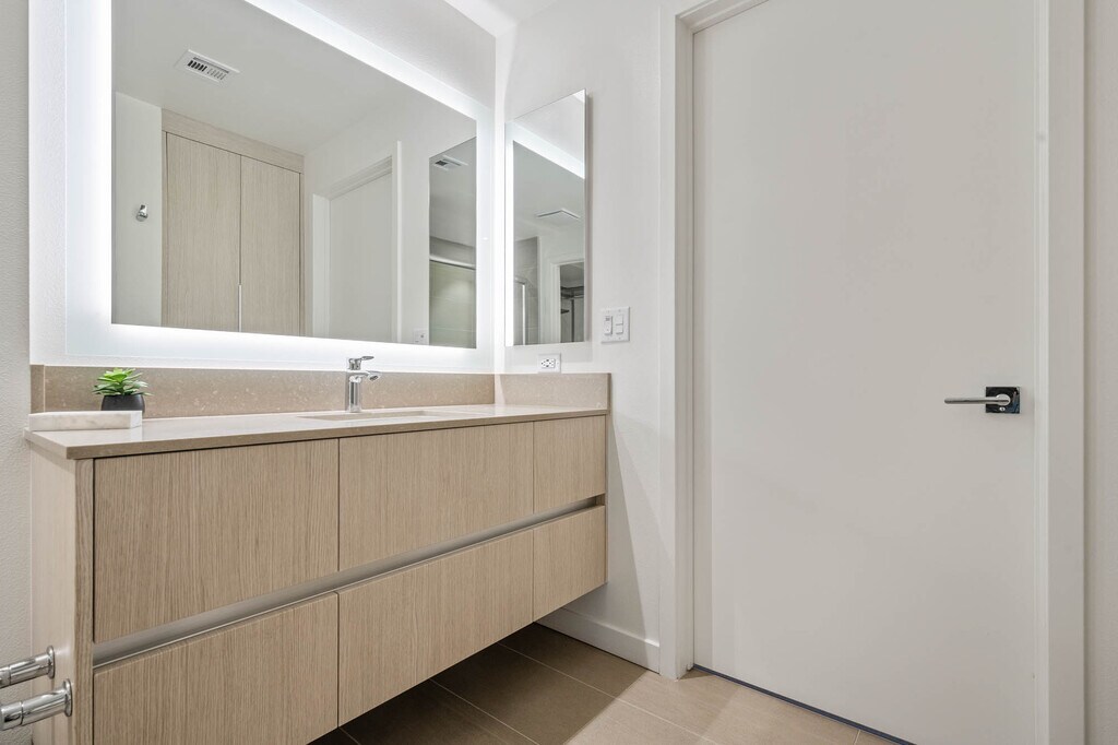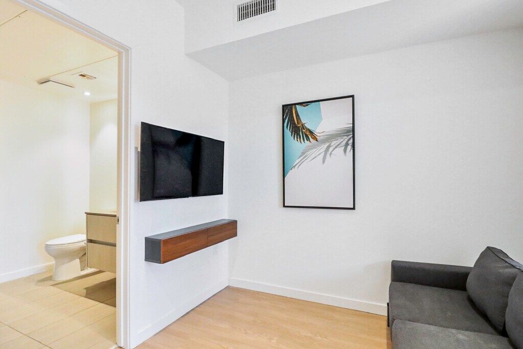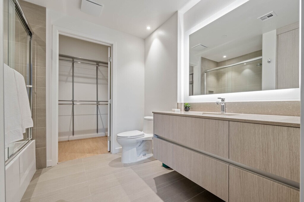 Enjoy modern living in a private room within a brand-new shared home. Central air and heat, large windows and recessed lighting brighten the space, a spacious balcony, shared gourmet kitchen featuring stainless steel appliances, quartz counters, custom cabinets, and an oversized fridge. Enjoy a walk-in closet, luxe shared bath, $35/month bundled utilities, in-unit laundry, and resort-style amenities. *MODEL UNIT SHOWN - Details may vary*