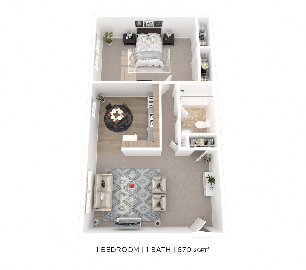 Apartment Model: One Bedroom - 670 sqftFrom $1,3751 Bedroom, 1 Bath, 670 sq ftAvailable Now![]()